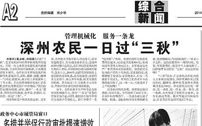 2019年8月20日《衡水日报》4版刊发的《“田保姆”改变传统耕种模式》,记录了阜城县崔家庙镇正丰粮食种植农民专业合作社推广农业生产托管服务的创新实践。75岁的王金枝老人给记者算了一笔账:“自己种,每亩地麦子收成七八百斤,各项花费700多元;半托出去,每亩地收成900斤,花费600多元”;深州市积极探索“村集体+专业合作社+农户”模式,截至2022年12月底,深州市农业生产托管服务的土地面积已达560余万亩次,各类农业生产托管服务的主体已超过560家(2022年12月7日8版)。