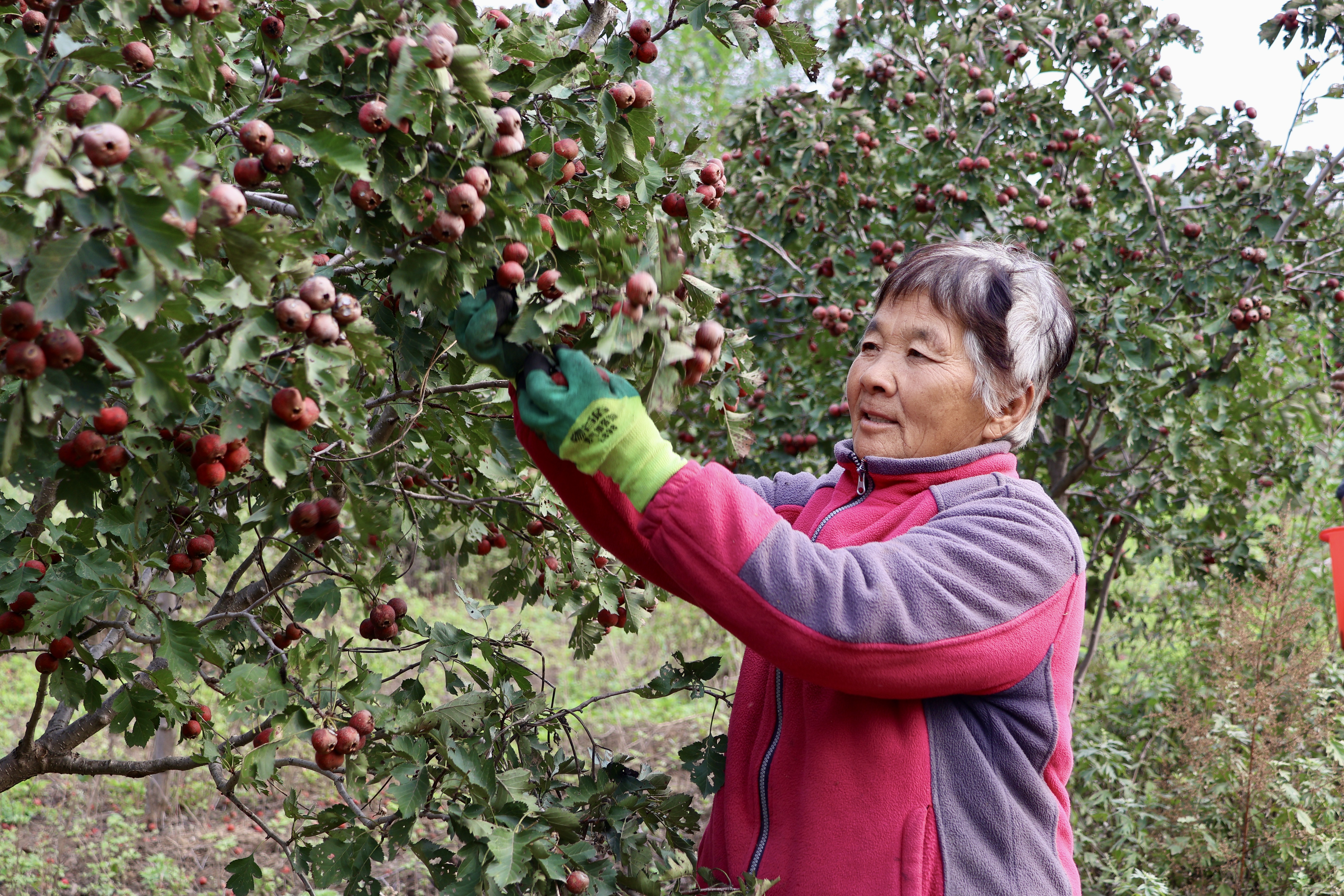 采摘现场分工明确,热火朝天。有人搬梯子、剪果枝,有人分拣筛选,将虫蛀果、小果挑出,只留下饱满鲜亮的果实装袋。欢声笑语间,一袋袋饱满的山楂很快堆成了小山。村民赵文荣一边麻利地系着袋口,一边感慨:“以前这地块都是杂草,影响村容村貌,现在变成了‘聚宝盆’,每年这个时候党员们都带头忙活,俺们跟着搭把手也高兴!”