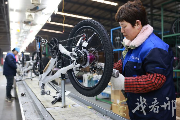 11月3日,位于广宗县的河北天王自行车科技有限公司生产车间内,车身组装、轮圈校正、车架搬运等环节有序衔接,一辆辆融入定制化设计的自行车下线,即将发往欧洲、美洲。
