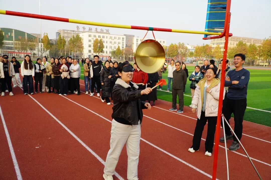 “同心击鼓”项目最考验团队的凝聚力。大家紧盯鼓面,随着鼓声节奏调整步伐,齐心协力精准敲击,鼓声与欢呼声交织成最美的乐章。“蒙眼敲锣”则充满了惊喜与欢乐。蒙着眼的教职工在同伴的指引下摸索前进,偶尔的“跑偏”引得全场大笑,成功敲锣时的欢呼更是感染力十足。