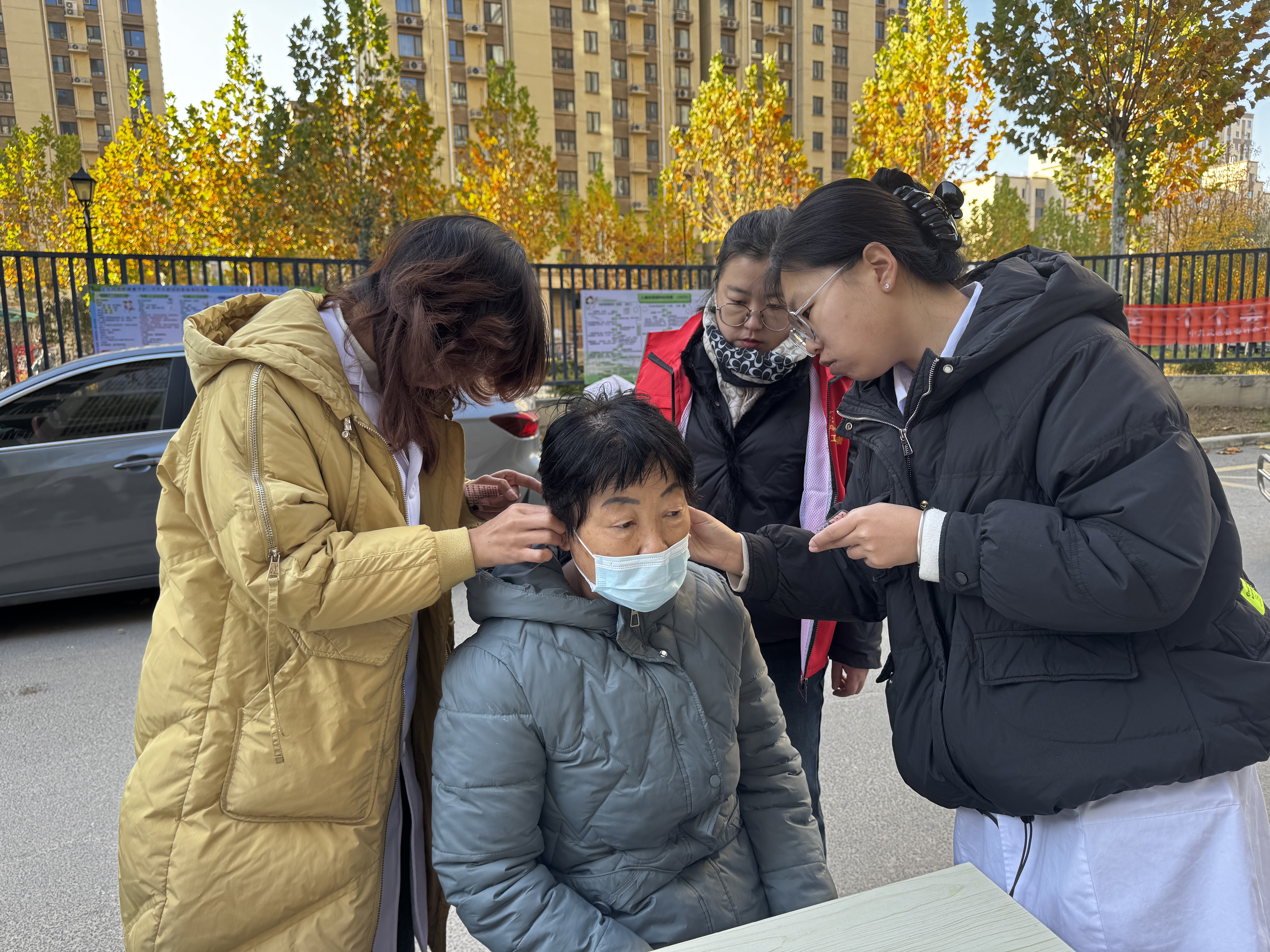 上午九点,服务点前便围满了闻讯而来的居民。社区工作者面前,“业务咨询”“政策宣传”等标识牌醒目摆放,他们正耐心为老人讲解养老补贴申领条件与流程;志愿者手持登记本,认真记录居民反映的生活需求与建议。义诊区最为热闹,医护人员忙着为老人检测听力、测量血压血糖,针对高血压、失眠、关节疼痛等中老年常见病,给出专业解答与调理建议。