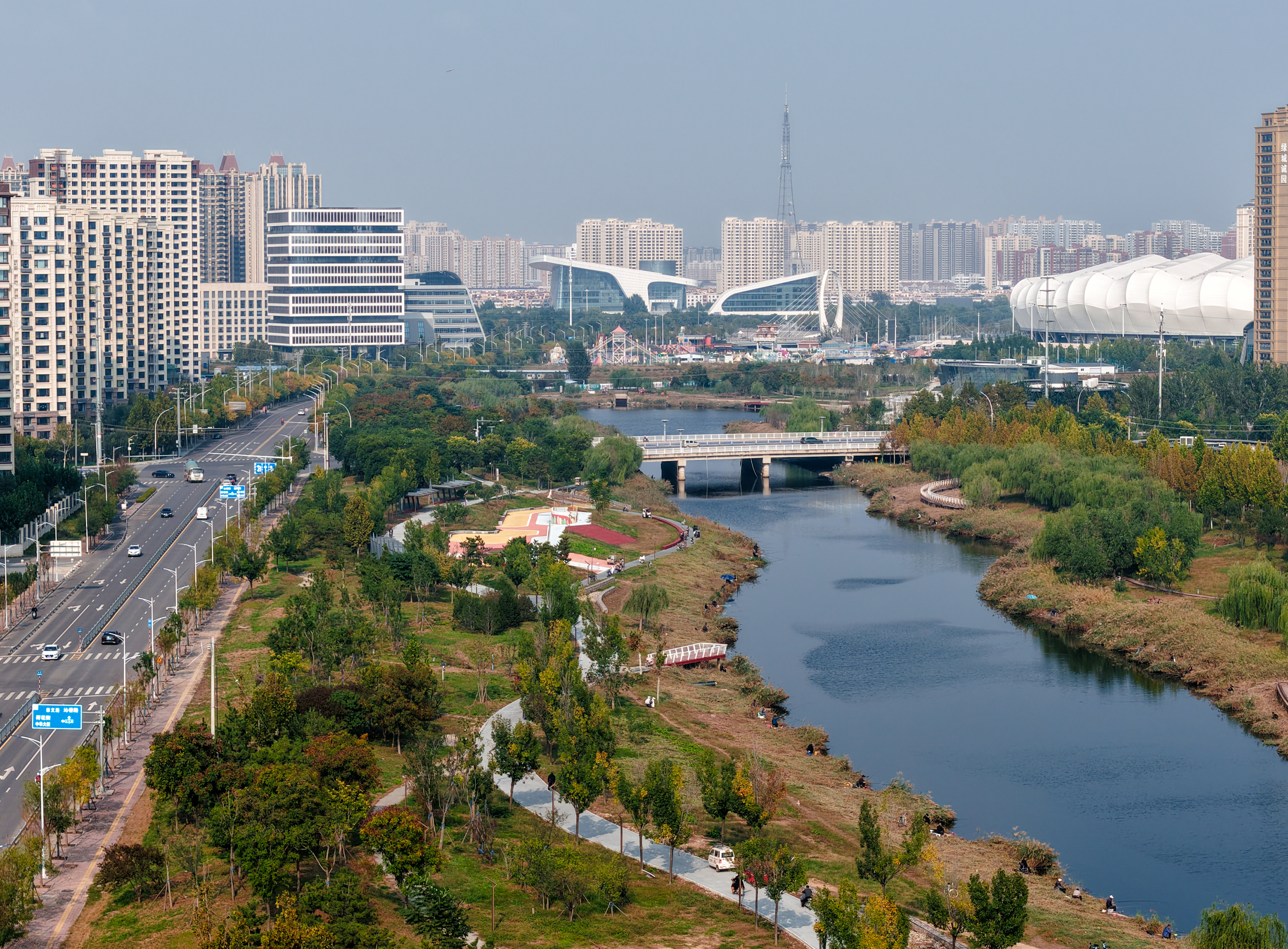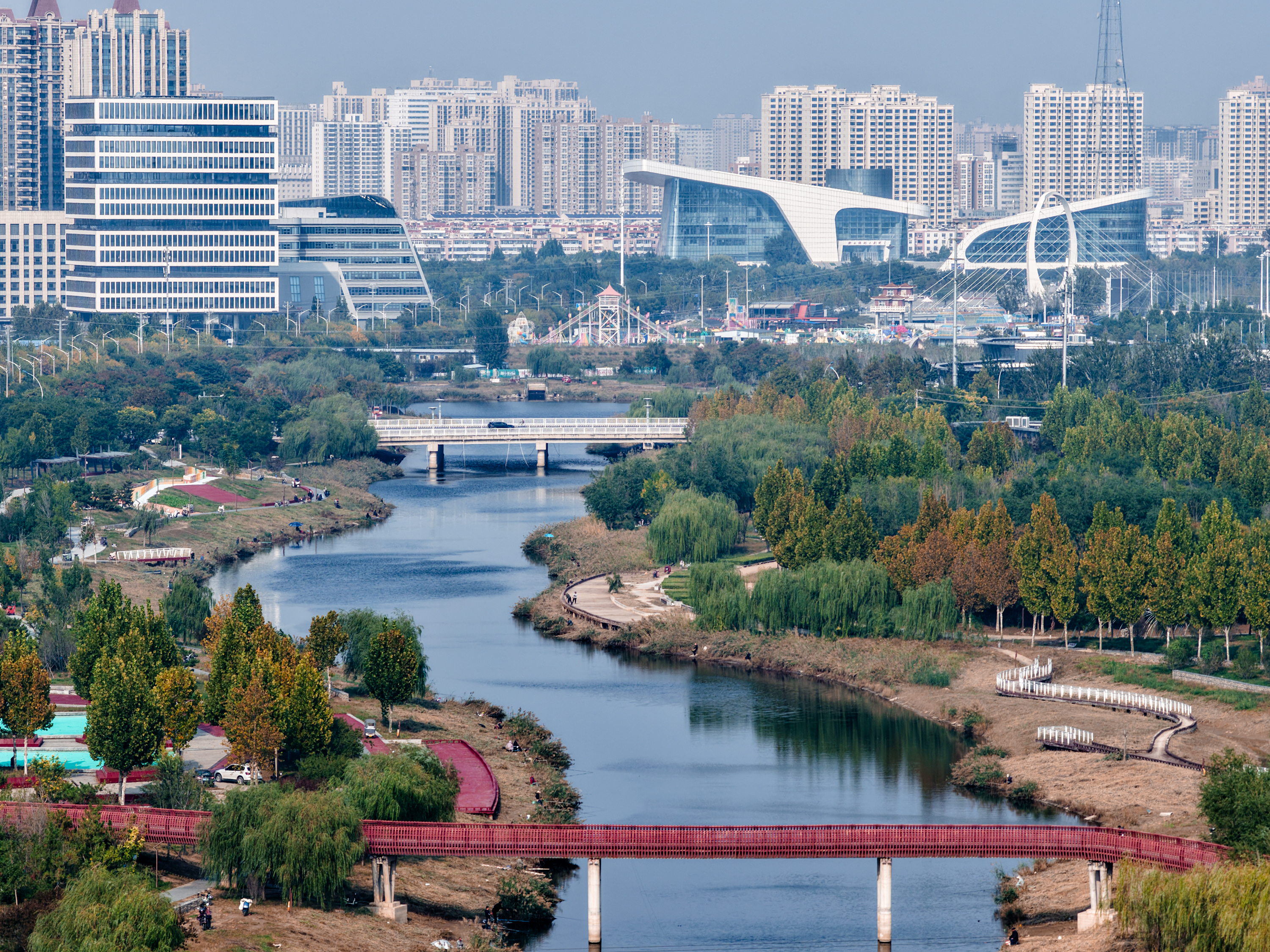 公园传承清光绪年间吴汝纶治水遗志,通过河道清淤、植被恢复等工程,让昔日淤塞的古渠重焕生机。如今,彩色步道串联起主题广场与观景台,野鸭游弋水面,市民健身、垂钓赏景,尽显人水和谐。