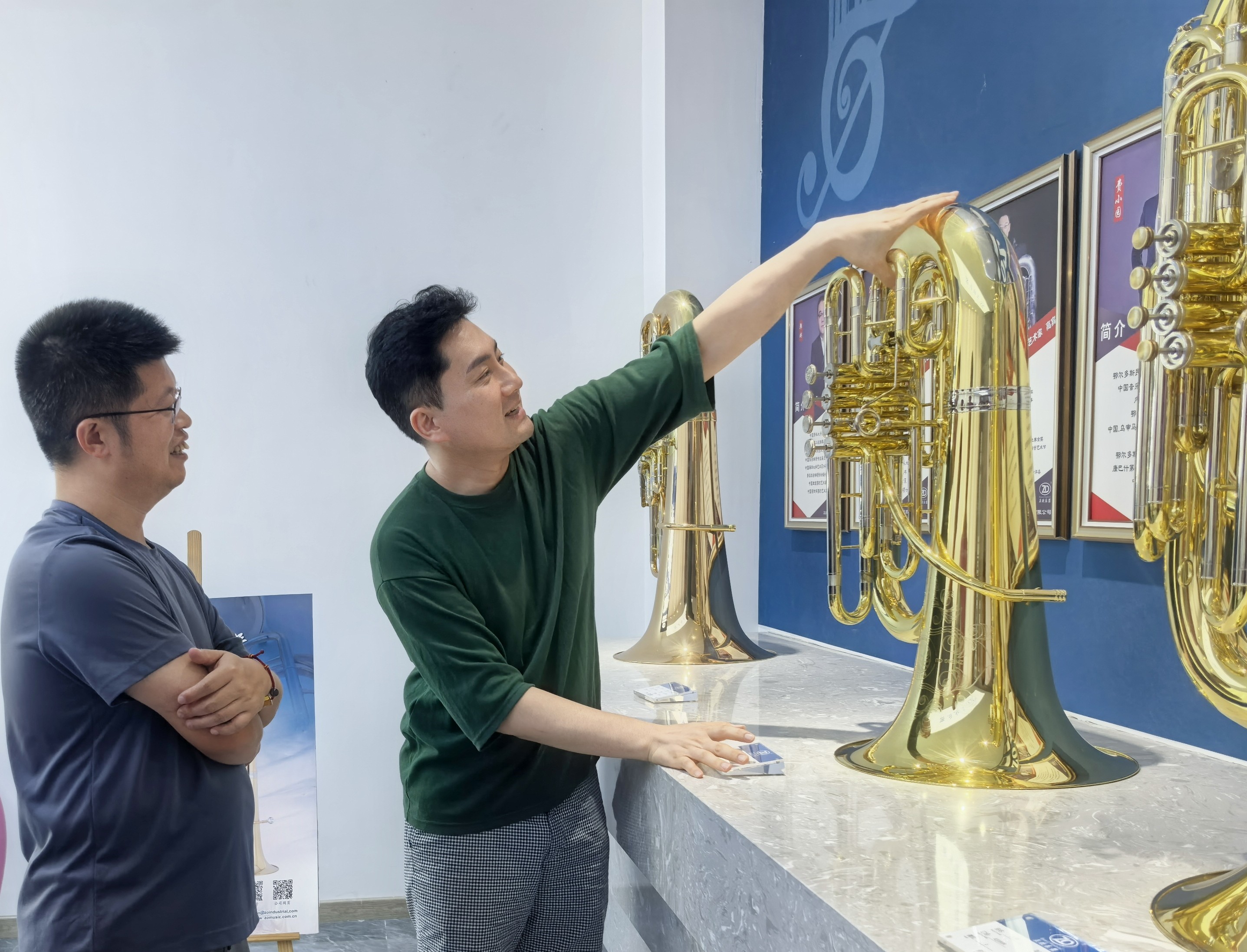 文志雄(右)参观公司乐器展厅。王天祥摄