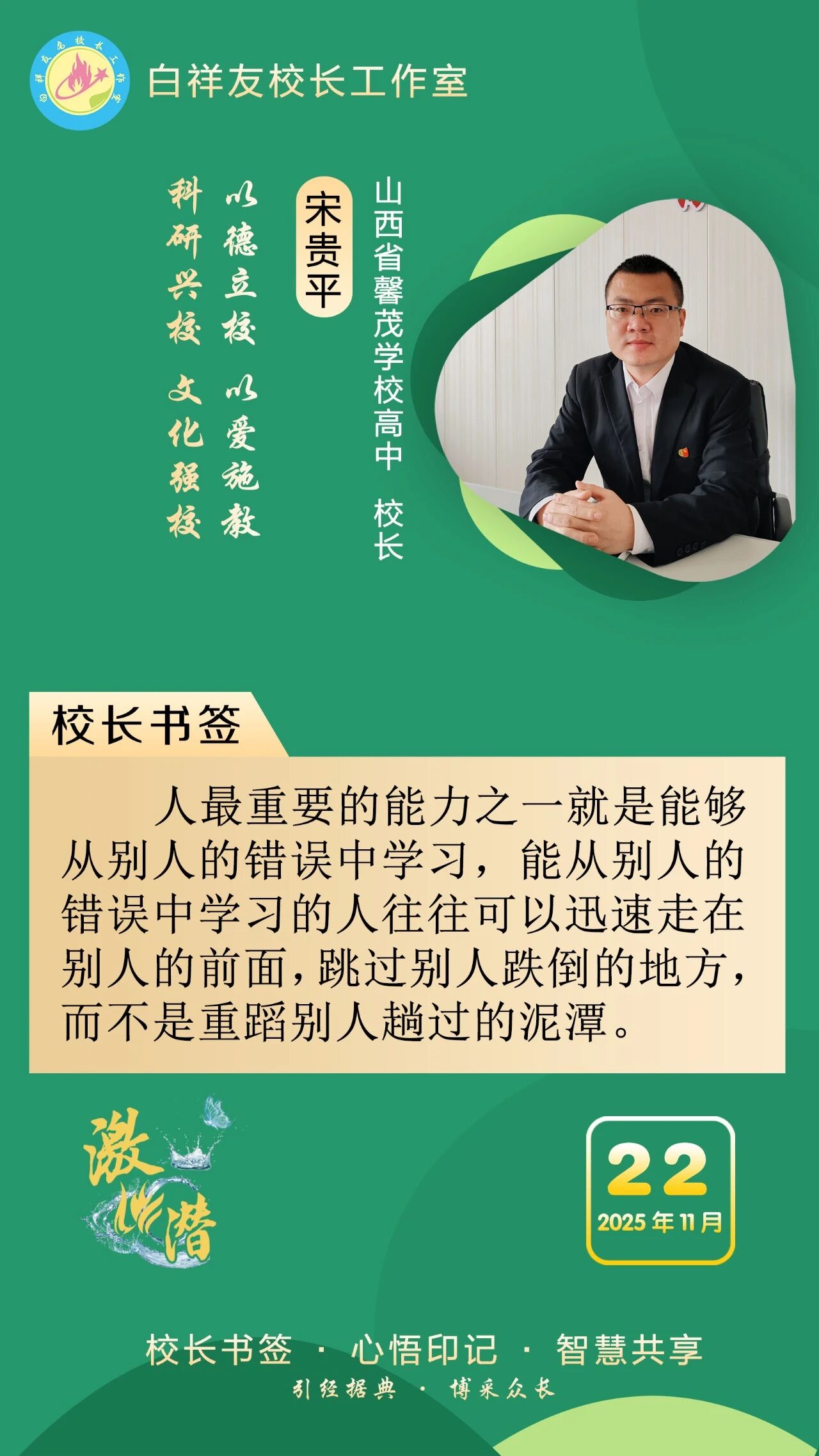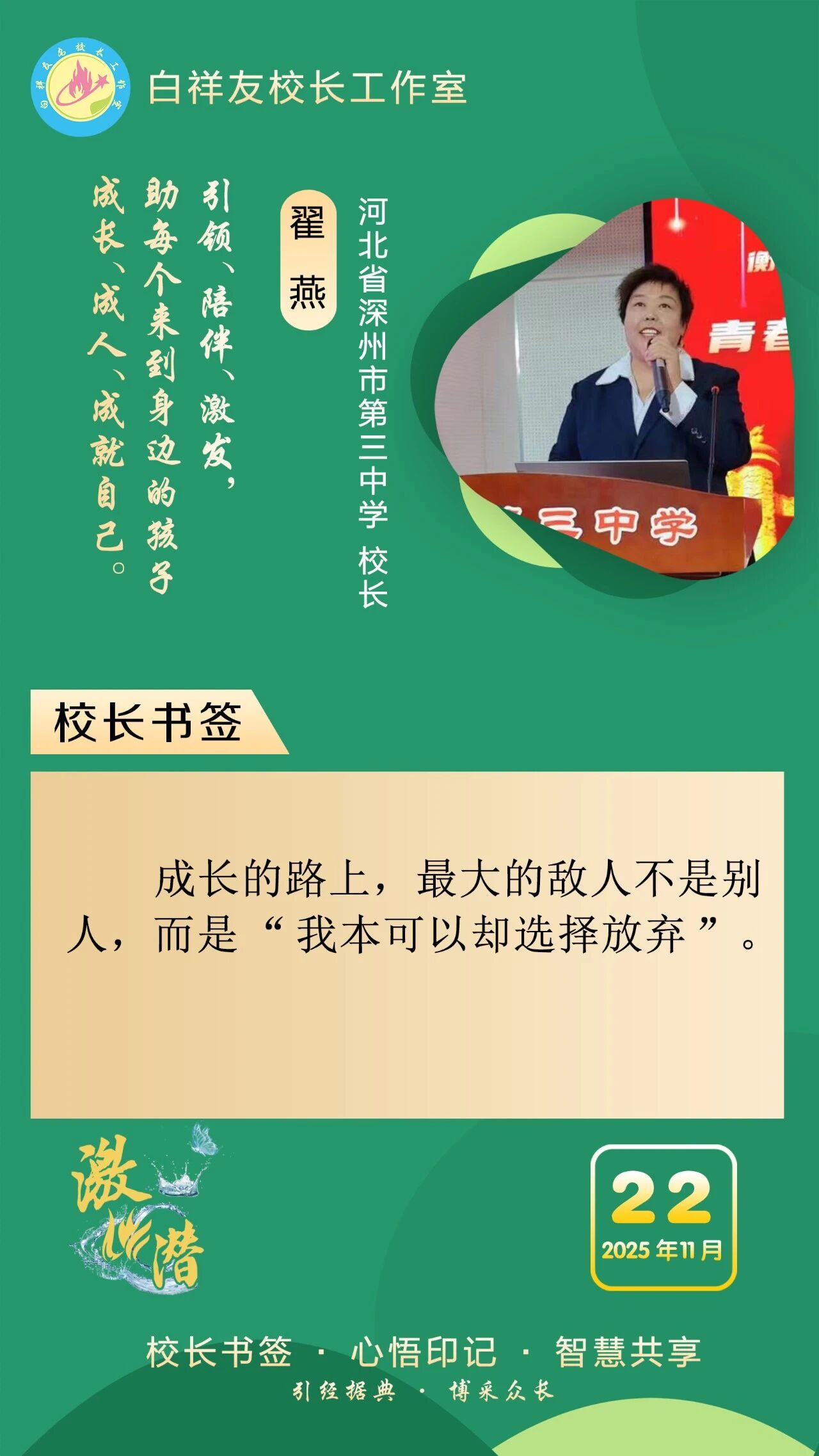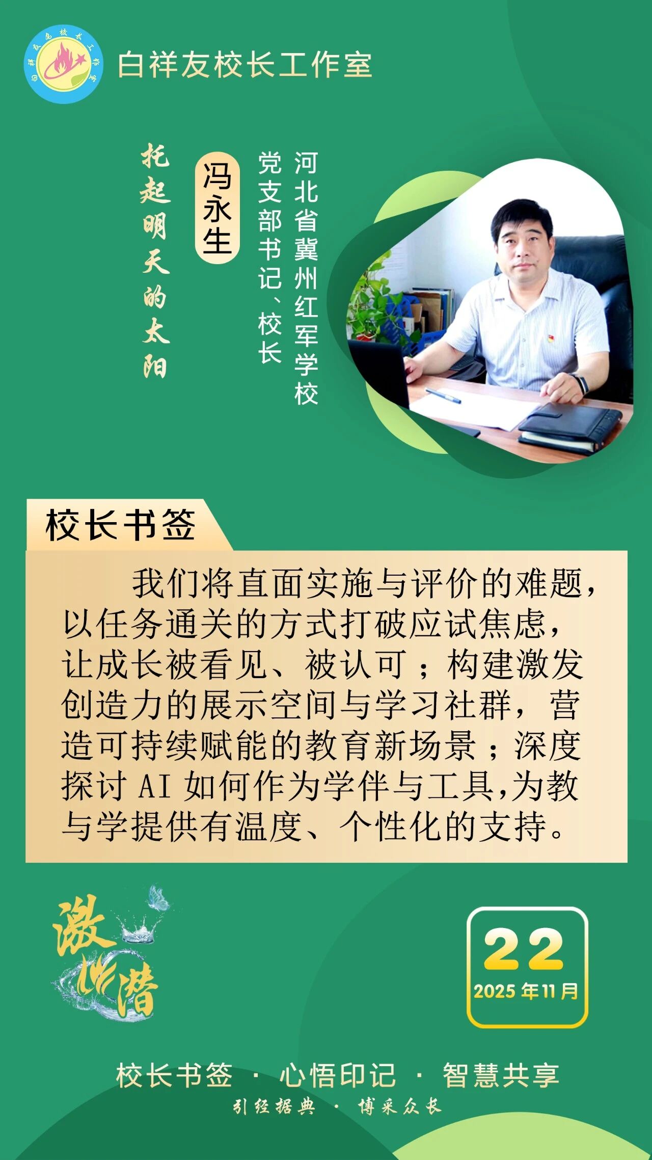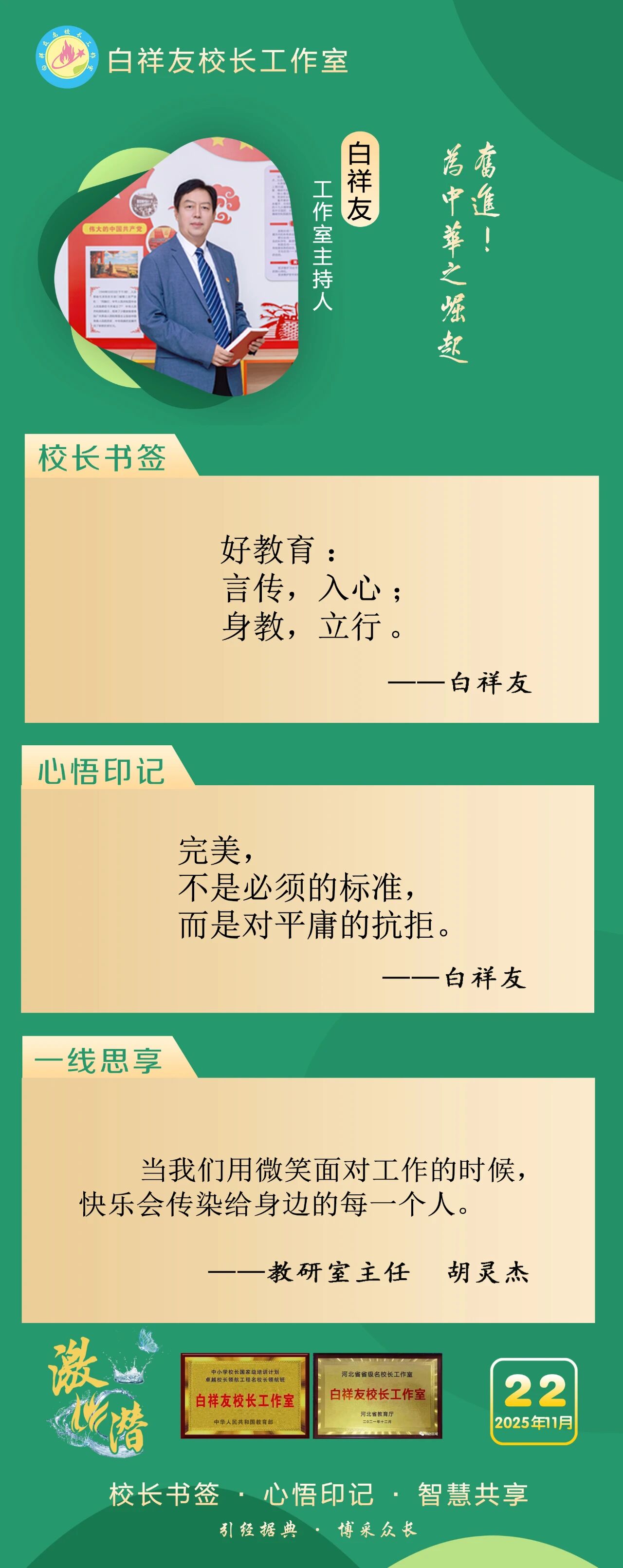 “白祥友校长工作室”成立于2019年4月,是教育部“国培计划”中小学名校长领航工程、河北省首批名校长工作室,目前省内外成员校59所。工作室坚持“资源共享、智慧共融、互助共赢”理念,已成为思想碰撞的交流场,资源共享的品牌站,成果展示的辐射源。