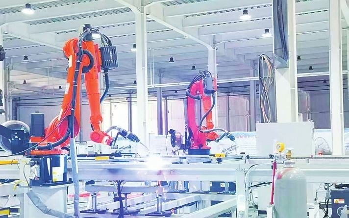 安平丝网集团共享智造工厂内,智能机械臂正在进行丝网焊接加工。