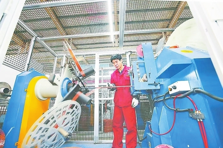 景县河北远大新特橡塑有限公司车间工人正在软芯编织线上工作。