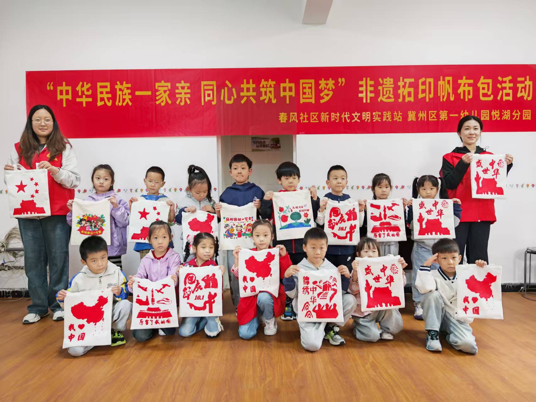 冀州区春风社区联合辖区幼儿园开展“中华民族一家亲 同心共筑中国梦”非遗拓印帆布包活动