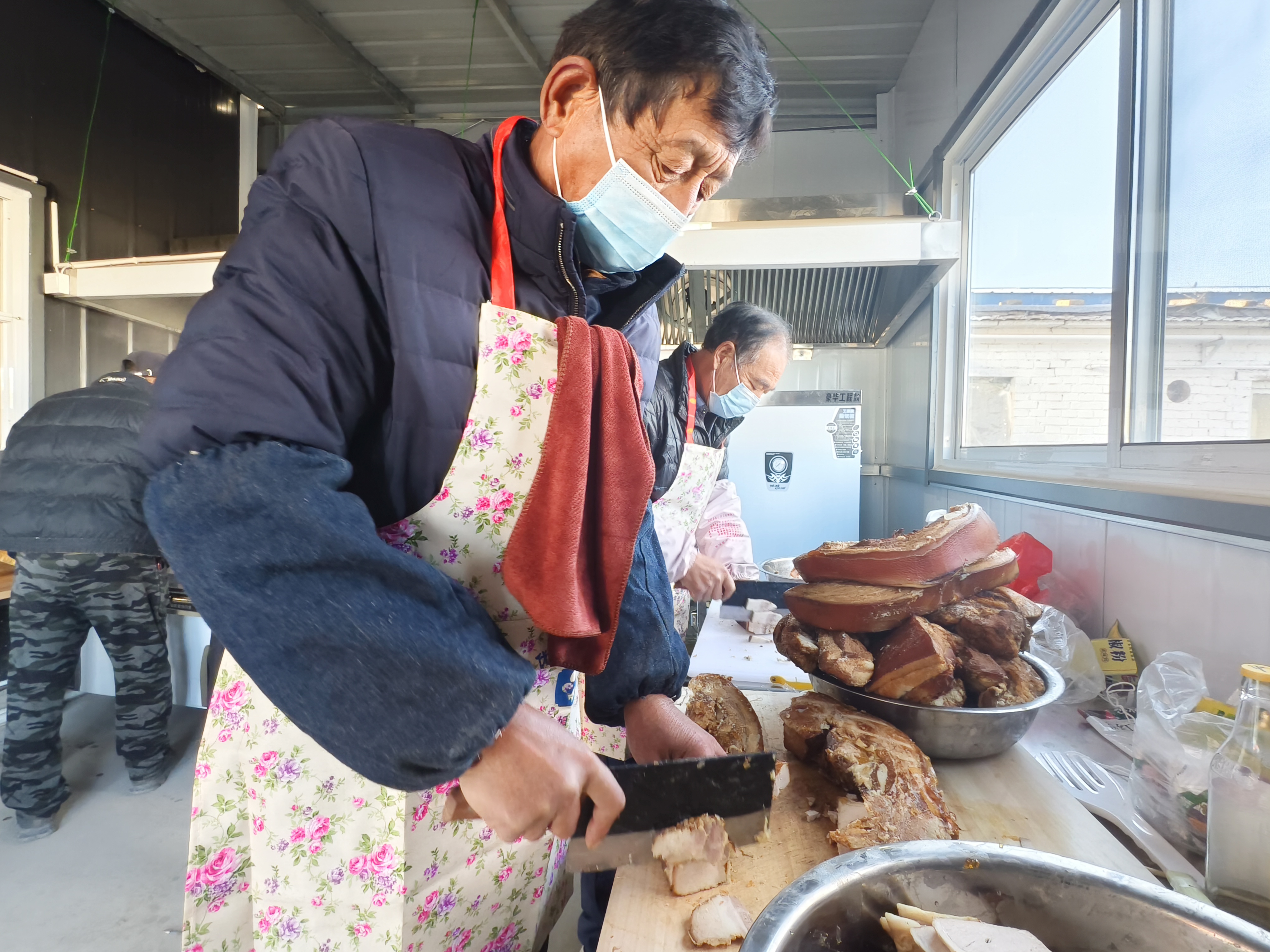 当天一大早,李世岩、回广会等十几位村民早早来到食堂,系上围裙、挽起袖子,主动承担起为全村老人准备暖心午餐的任务。“不到八点我们就开始忙活啦,能为村里食堂开张出一份力,心里特别高兴!”回广会一边利落地切着白菜,一边笑着说道。厨房里,切菜声、剁肉声、炖豆腐的咕嘟声此起彼伏,灶火旺旺地燃着,蒸腾的热气中弥漫着浓浓的饭菜香。