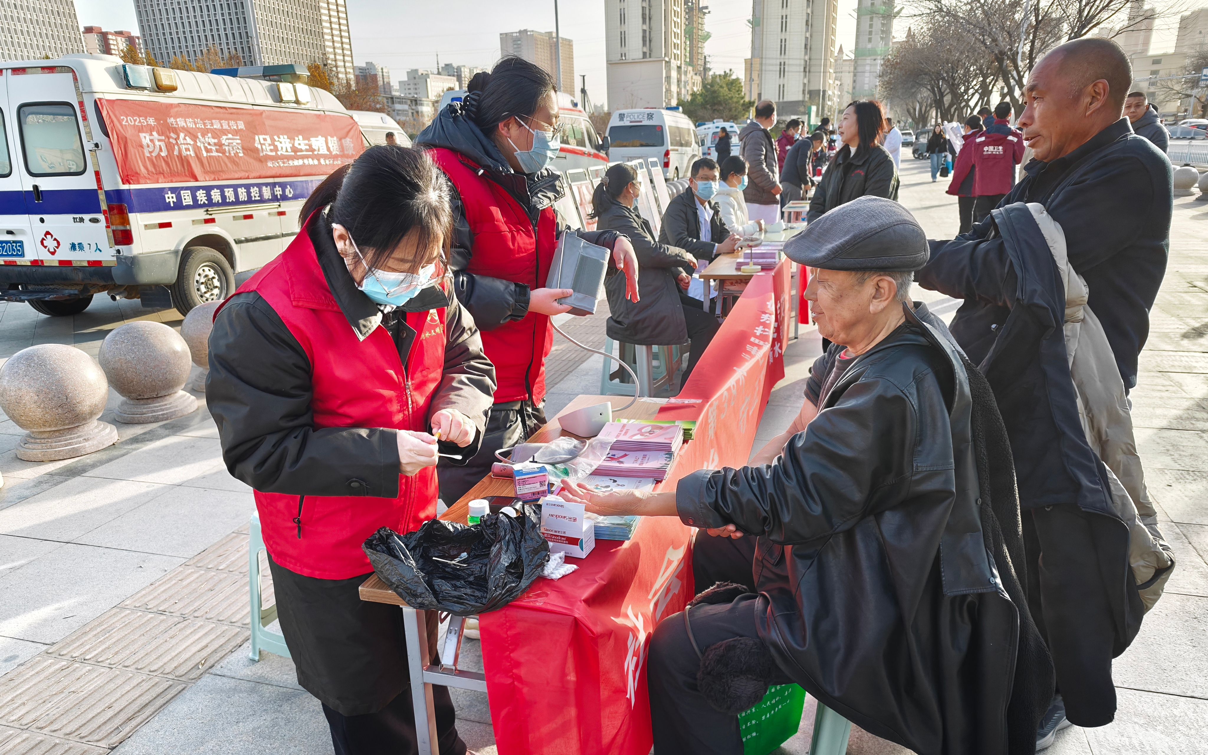 活动现场,各部门工作人员、高校志愿者与医护人员采用“宣传+义诊”模式,为群众提供全方位健康服务。宣传区通过悬挂横幅、摆放展板、科普咨询、发放自检包等形式向过往群众科普艾滋病防治知识,引导大家树立科学防艾观念,主动做好自我保护。义诊区通过细致解答健康疑问、评估健康状况、测量血压、血糖,针对性提出防护建议与就医指导,为群众健康保驾护航。