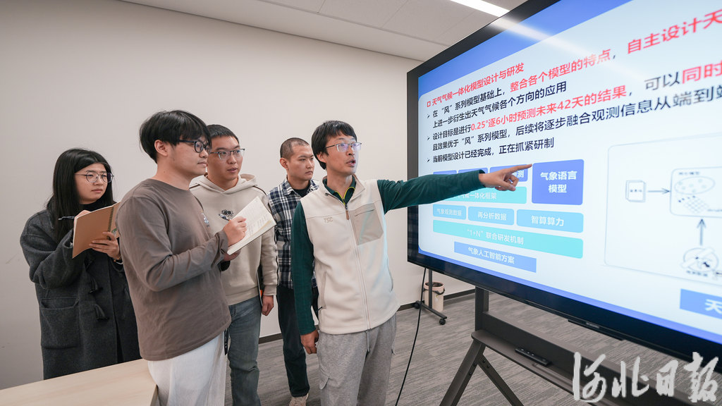 11月17日,雄安科学园内,雄安气象人工智能创新研究院首席架构师窦则胜团队成员讨论新一代天气气候一体化AI模型。河北日报见习记者李畅摄