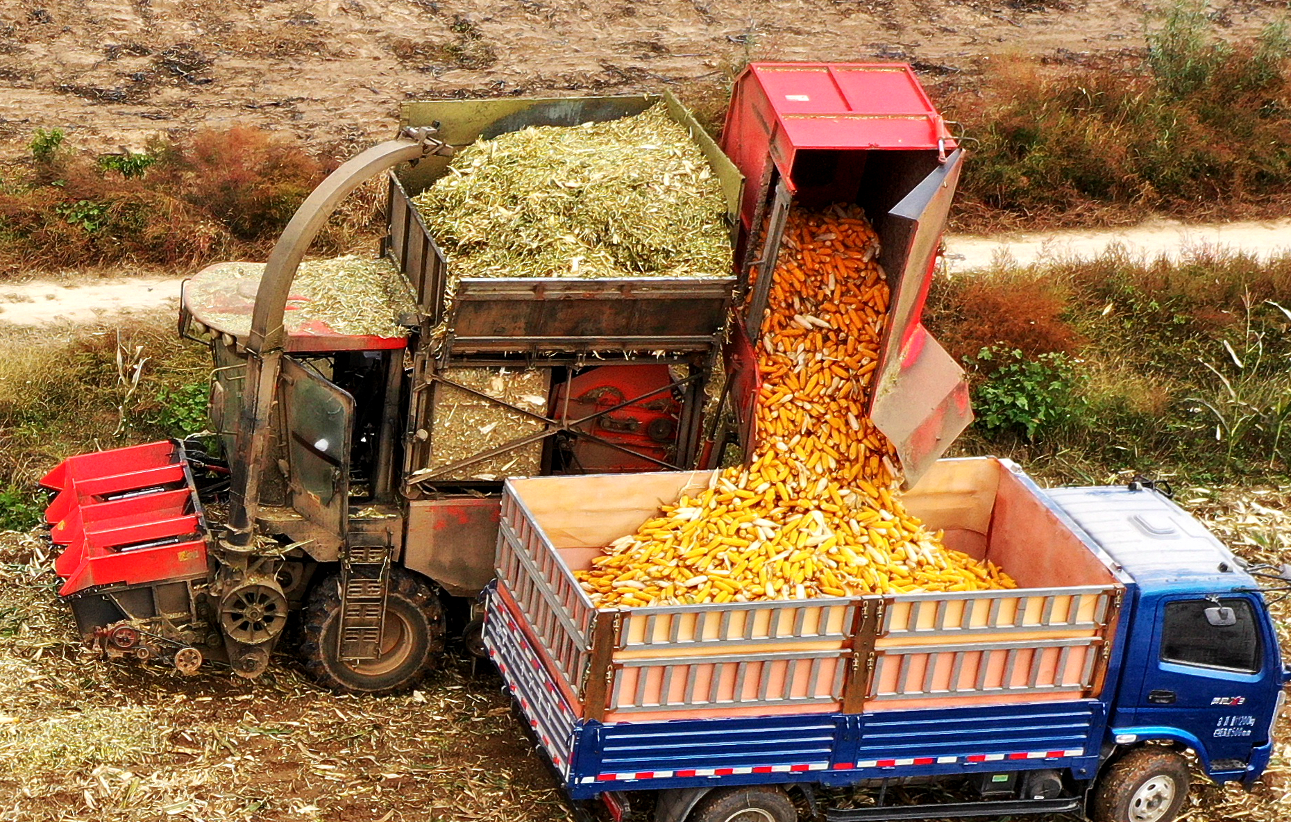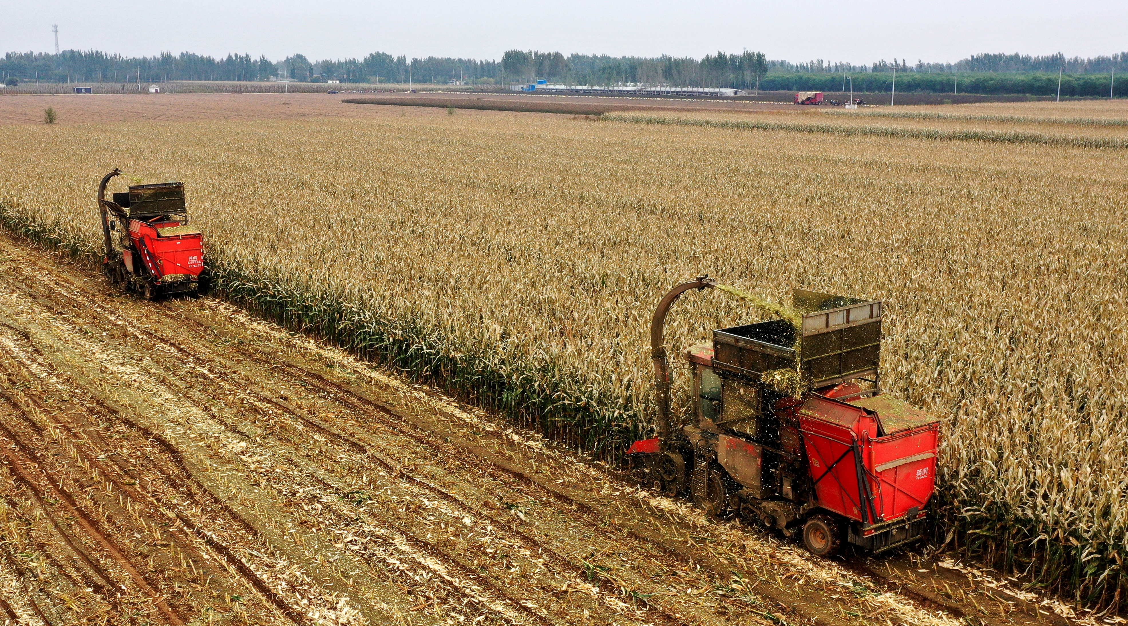 张家桥村投资200多万元购置了10台茎穗兼收玉米联合收割机。每年秋收,这些“大家伙”免费为崔家庙镇及周边乡镇的乡亲们收割玉米,并同步将秸秆回收,通过4条机械化秸秆加工生产线将其加工成肉牛饲草。