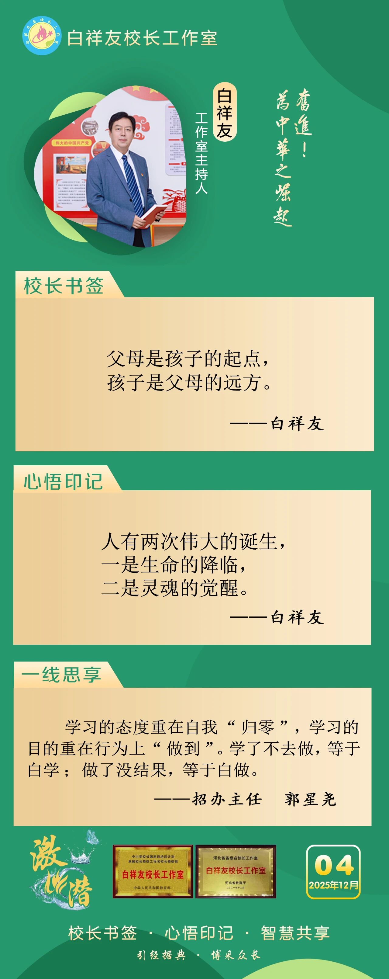 “白祥友校长工作室”成立于2019年4月,是教育部“国培计划”中小学名校长领航工程、河北省首批名校长工作室,目前省内外成员校59所。工作室坚持“资源共享、智慧共融、互助共赢”理念,已成为思想碰撞的交流场,资源共享的品牌站,成果展示的辐射源。