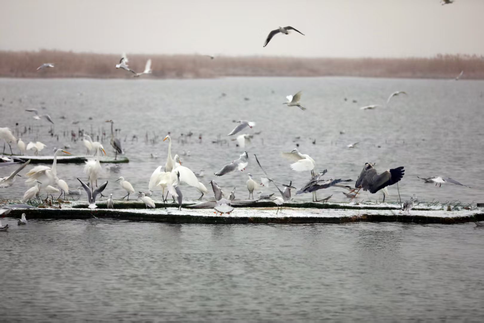 12月12日,受寒潮影响,华北地区普降瑞雪。享有“京津冀最美湿地”的衡水湖畔银装素裹,数以万计的红嘴鸥、大雁、白鹭等越冬候鸟在此觅食嬉戏,构成一幅生机盎然的冬日生态画卷。