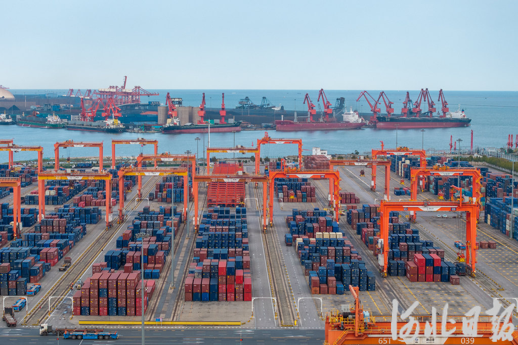 无人机拍摄的唐山港京唐港区集装箱码头堆场。河北日报记者 赵杰 摄