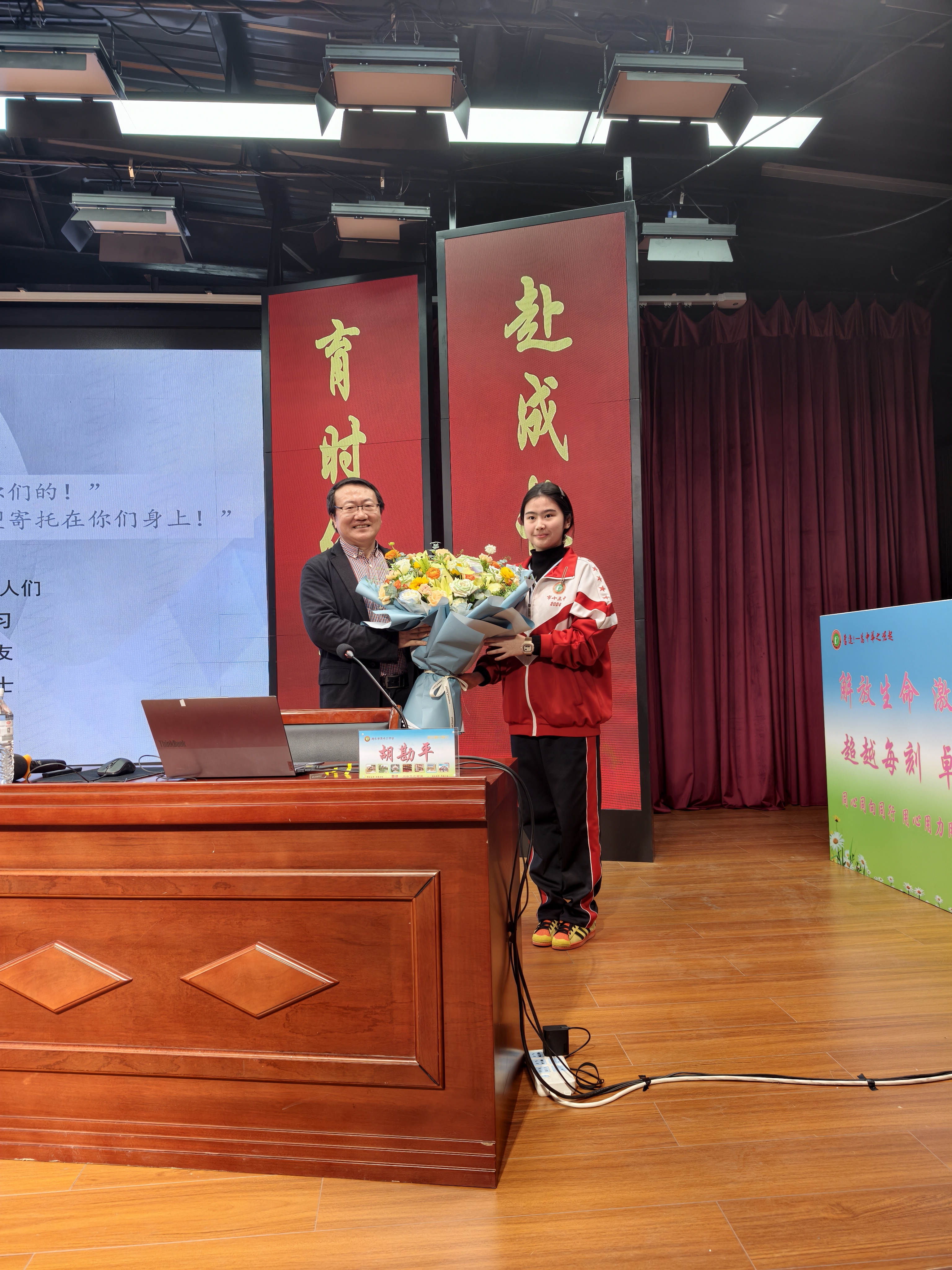 衡水十三中学生代表为胡勘平教授献花。王斌 摄