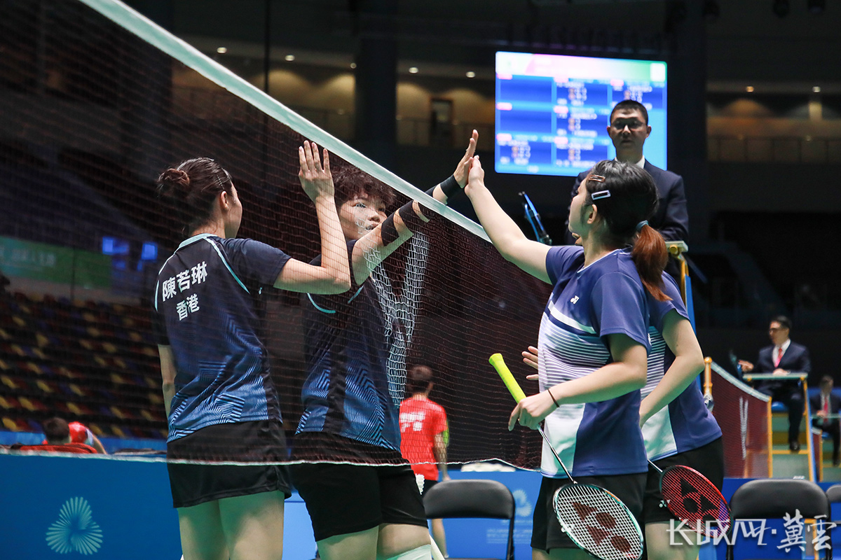 ▲12月13日,全国残特奥会羽毛球听障女子双打比赛中,河北运动员与香港运动员击掌致意。长城网·冀云客户端记者 李皓 摄