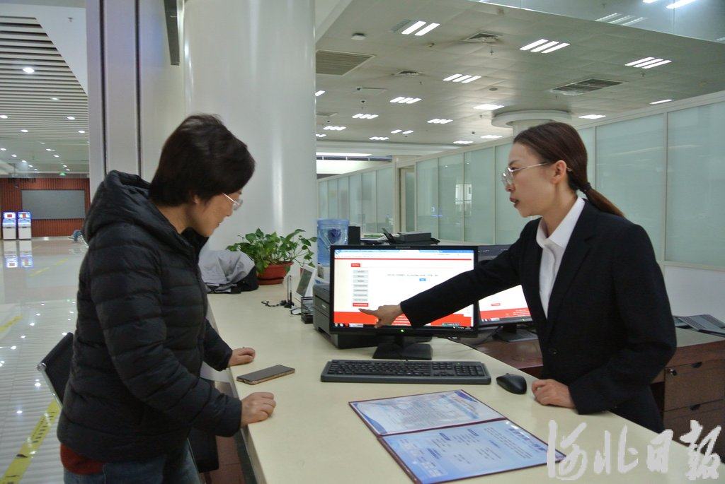 在沧州市政务服务中心,沧州市行政审批局工作人员(右)向办事群众介绍如何便捷获取专项信用报告。(河北日报资料片)河北日报记者王雅楠摄