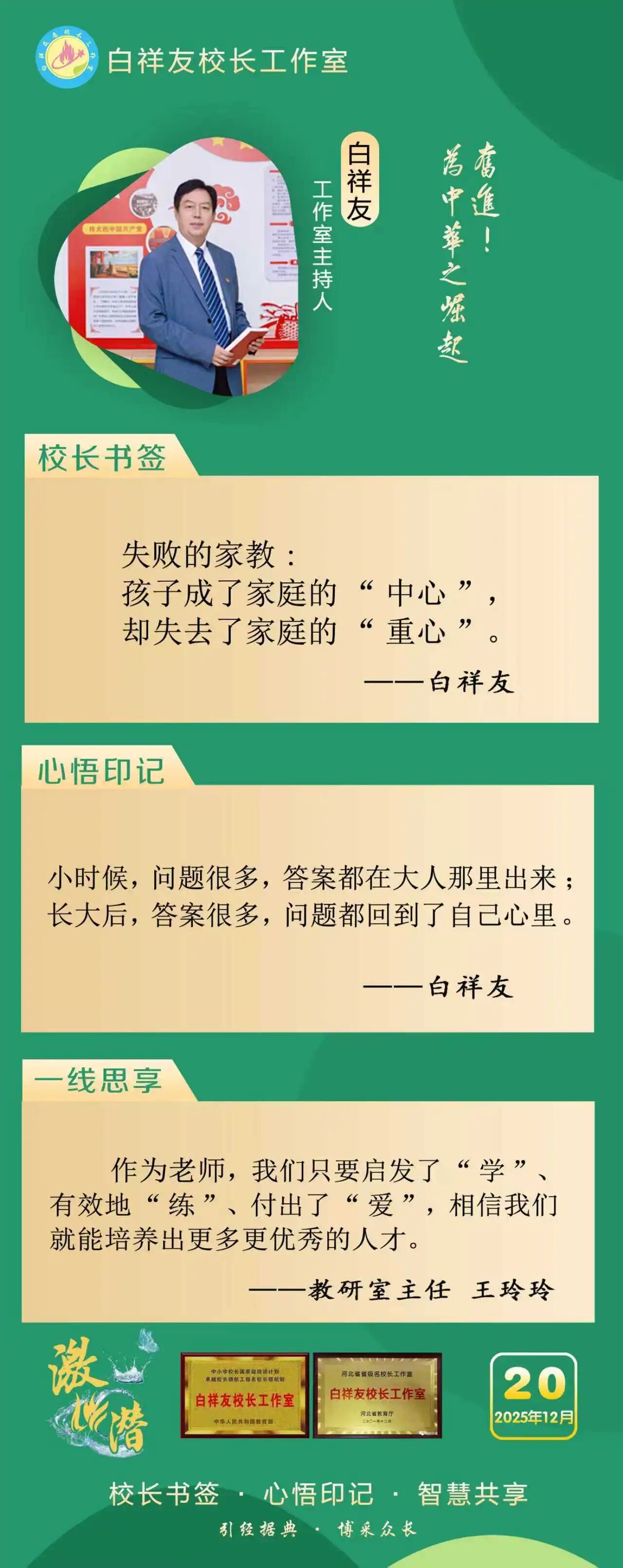 “白祥友校长工作室”成立于2019年4月,是教育部“国培计划”中小学名校长领航工程、河北省首批名校长工作室,目前省内外成员校59所。工作室坚持“资源共享、智慧共融、互助共赢”理念,已成为思想碰撞的交流场,资源共享的品牌站,成果展示的辐射源。
