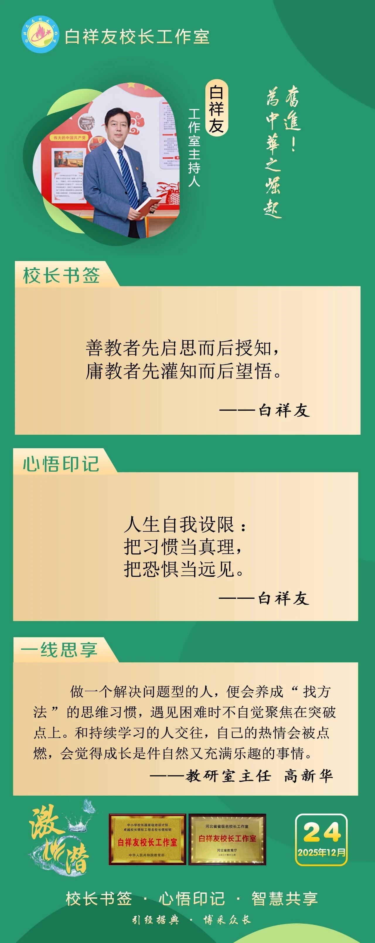 “白祥友校长工作室”成立于2019年4月,是教育部“国培计划”中小学名校长领航工程、河北省首批名校长工作室,目前省内外成员校59所。工作室坚持“资源共享、智慧共融、互助共赢”理念,已成为思想碰撞的交流场,资源共享的品牌站,成果展示的辐射源。