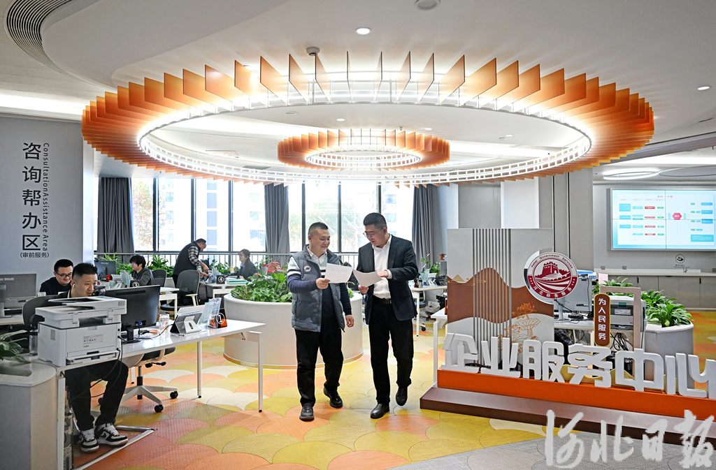 11月21日,石家庄市政务服务中心工作人员(右一)为企业办事员提供服务。河北日报记者 张昊摄