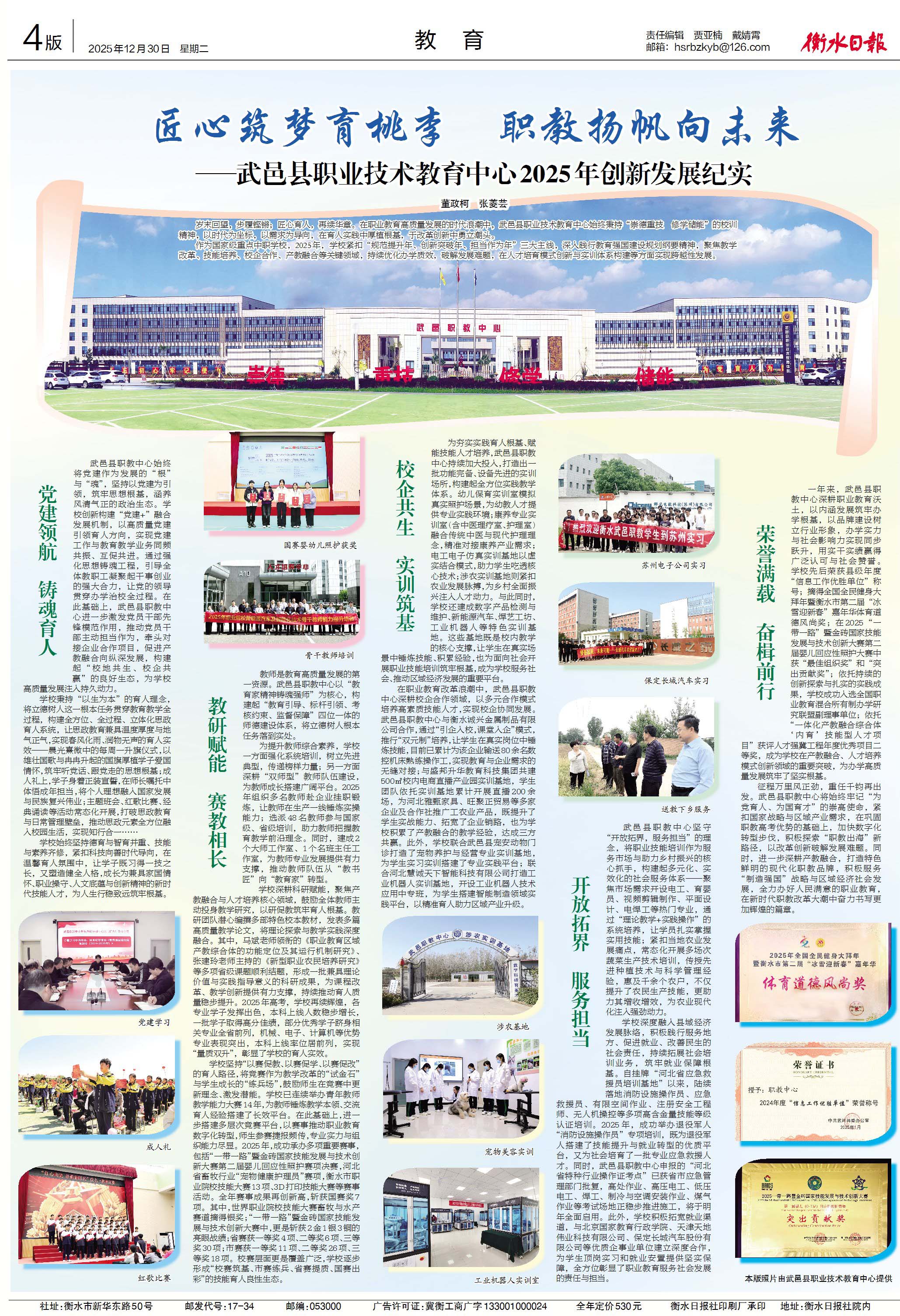岁末回望,步履铿锵;匠心育人,再续华章。在职业教育高质量发展的时代浪潮中,武邑县职业技术教育中心始终秉持“崇德重技 修学储能”的校训精神,以时代为坐标,以需求为导向,在育人实践中厚植根基,于改革创新中勇立潮头。