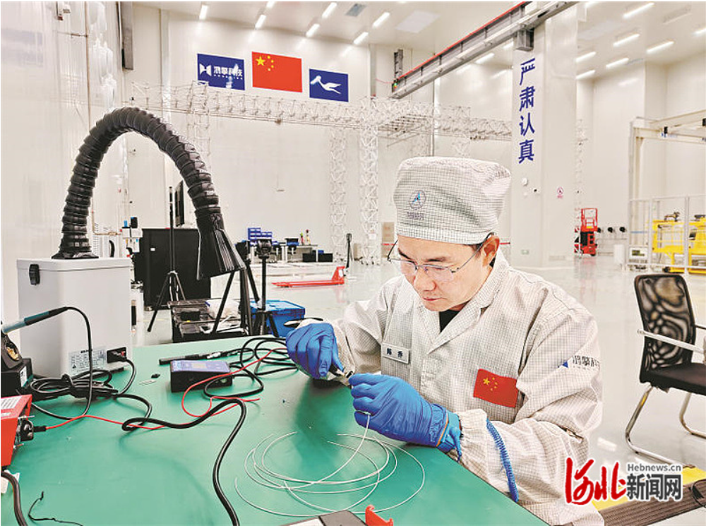 1月1日,蓝箭鸿擎(雄安)空间科技有限公司的厂房内,工程师正在为“雄安一号”卫星进行热实施电缆焊接。张佳旺摄