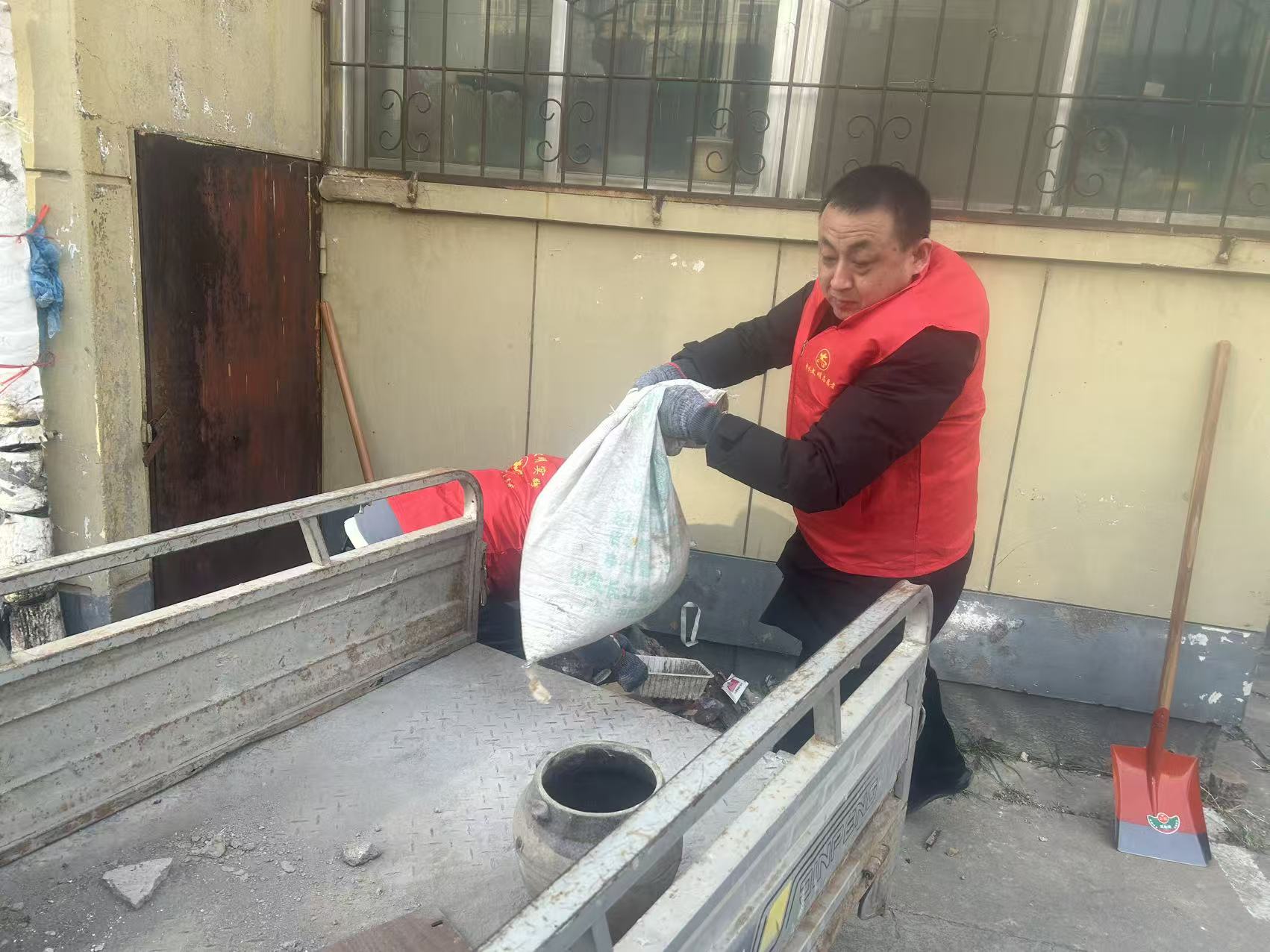 活动中,志愿者们分工明确、默契协作,手持捐赠的清洁工具深入小区楼道、绿化带、闲置角落等重点区域。大家弯腰俯身清扫散落垃圾,用铁锨铲除地面顽固污渍,借耙子细致梳理杂草落叶,以簸箕分类收纳各类杂物。尽管寒风凛冽,但丝毫没有阻挡大家的热情,志愿者们的辛勤付出也赢得了过往居民的赞许,不少居民还主动加入清理队伍,形成了“社企牵头、全民参与”的良好氛围。