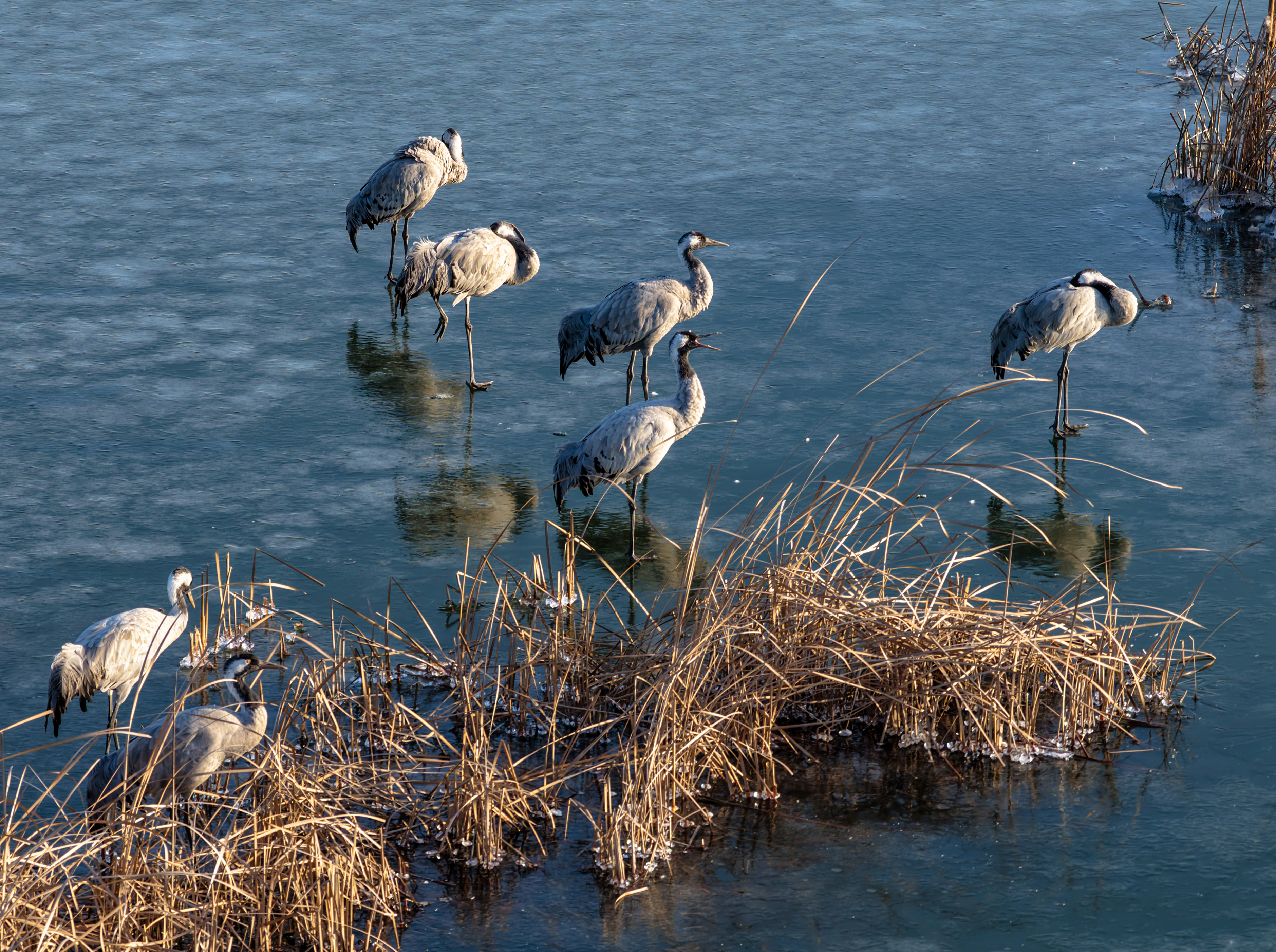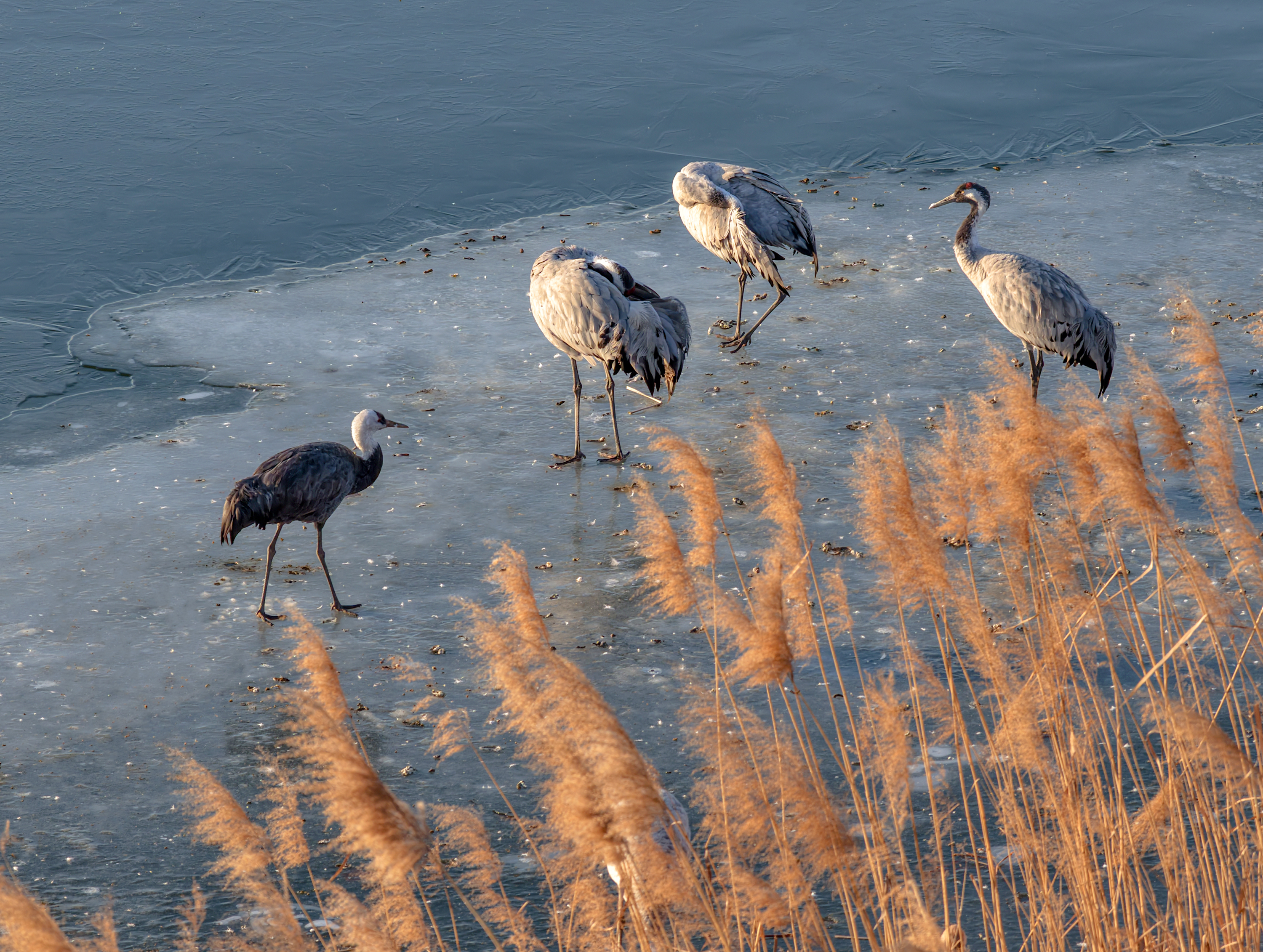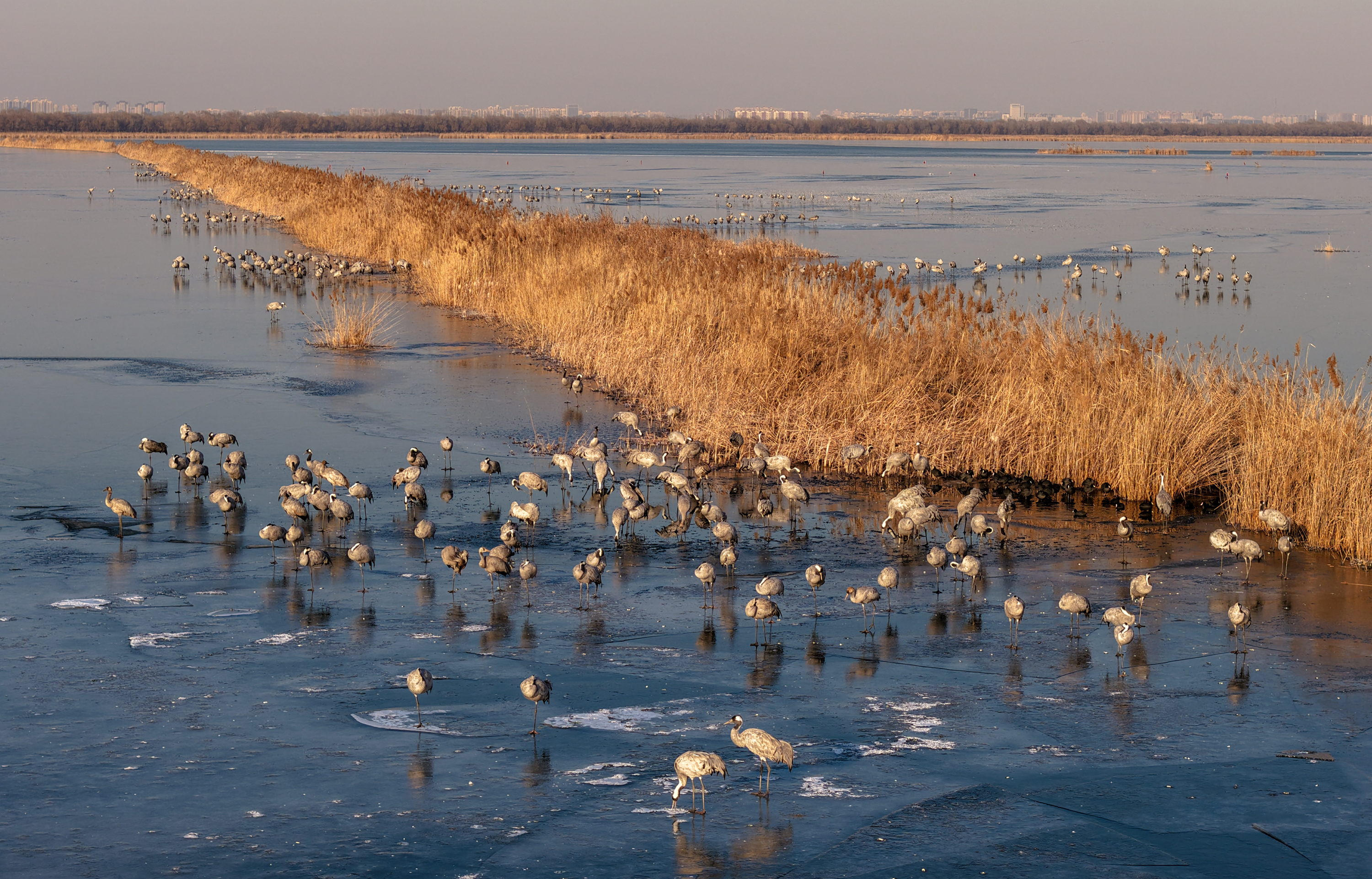 大寒时节,河北衡水湖湿地正是鹤群的乐园。冰封的湖面上,千余只灰鹤或伫立休憩,或踱步觅食,在金黄芦苇的映衬下,构成一幅静谧而充满生机的冬日图景。