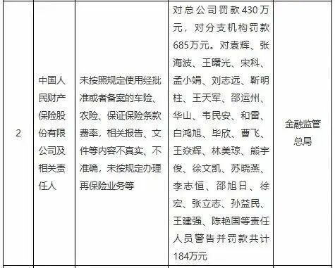 其中,金融监管总局对人保财险总公司罚款430万元,对分支机构罚款685万元。在落实双罚制方面,金融监管总局对袁辉、张海波、王曙光、宋科、孟小娟、刘志远、靳明柱、王天军、邵运州、华山、韦民安、和雷、白鸿旭、毕欣、曹飞、王焱辉、林美琼、熊宇俊、徐文凯、苏晓燕、李志恒、邵旭日、徐宏、张立志、孙益民、王建强、陈艳国等责任人员警告并罚款共计184万元。