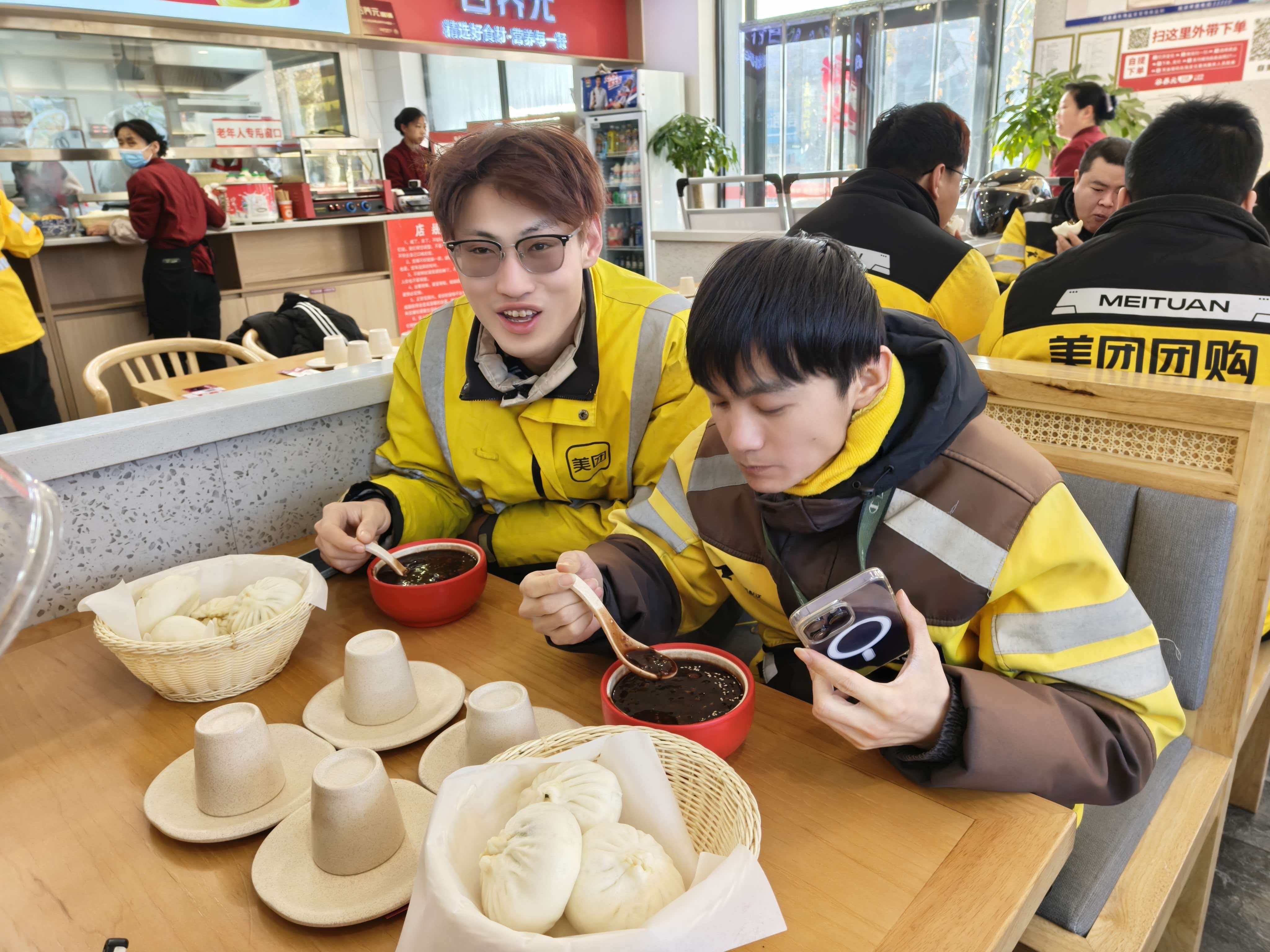 “天冷路滑,路上注意安全”“累了就到社区驿站歇脚”……送上热粥的同时,工作人员还化身“暖心使者”,与大家一起聊家常、谈生活,倾听他们工作生活情况,叮嘱他们注意保暖、注意安全。康泰社区工作人员表示:“平时都是小哥给我们送快递、送餐,今天也给他们服务一次。”