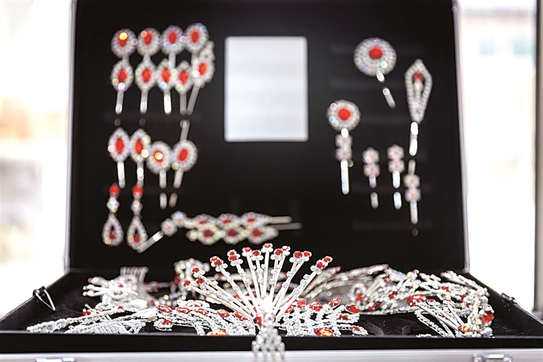七星额子、老旦凤冠、太子帽、财神帽、朝冠、帅盔、齐头……成品展示架上,陈列着一顶顶做工精美的戏剧盔头。“做一顶盔头需经过取样、打样、雕花、掐丝、扎边、刷胶、沥粉、油漆、贴金箔、点翠、串珠等多道工序组合定型,之后还要反复贴白金或黄金,并多次刷涂清漆,细算下来,要40多道工序。”许茂臣随手拿起一顶重二斤、高一尺二寸的凤冠举例,“做这一顶,熟练工需要半个月,随着材料和工具的迭代更新,效率就更高了”。