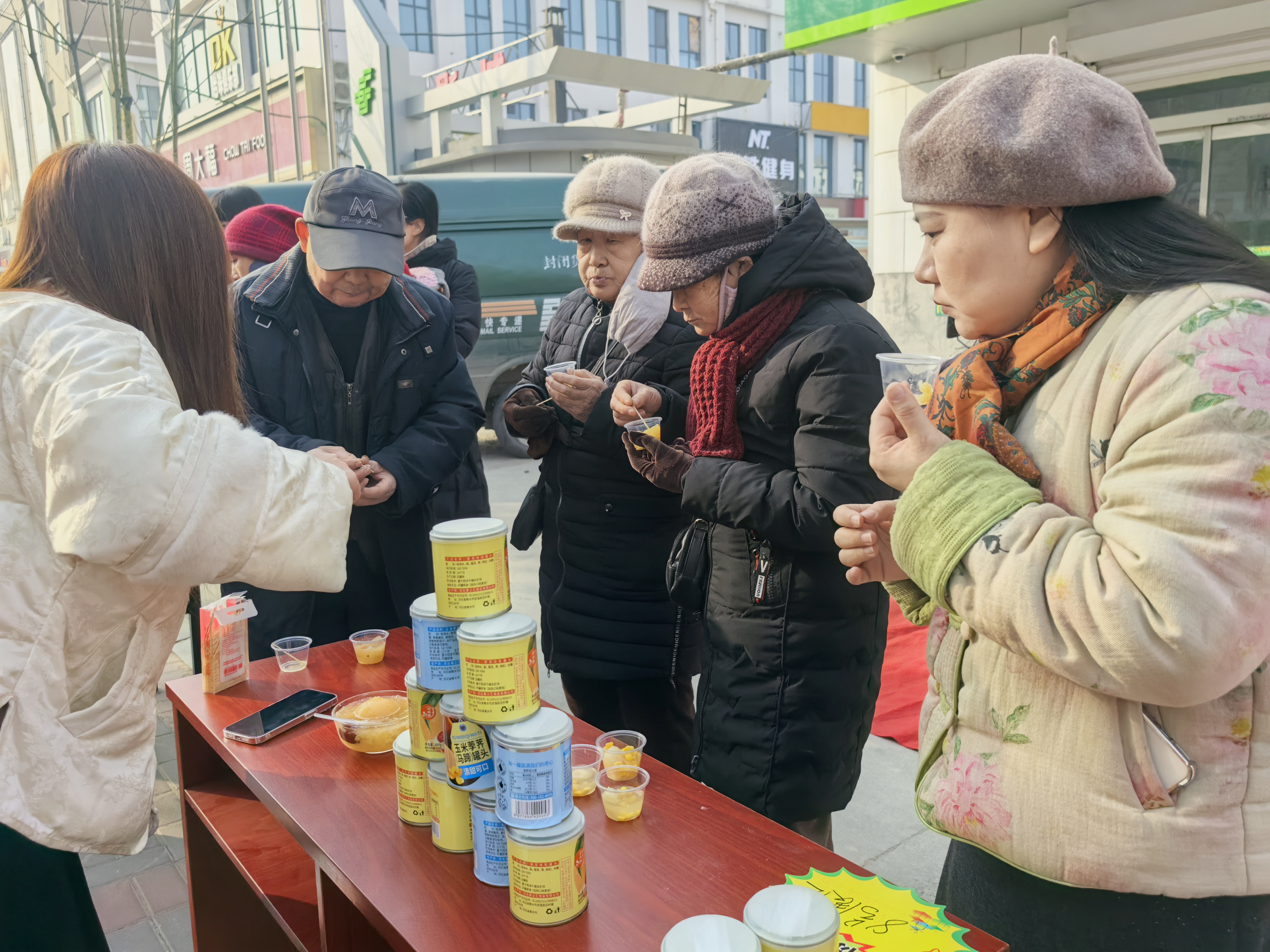 图为市民在试吃河北果之汇食品有限公司的罐头