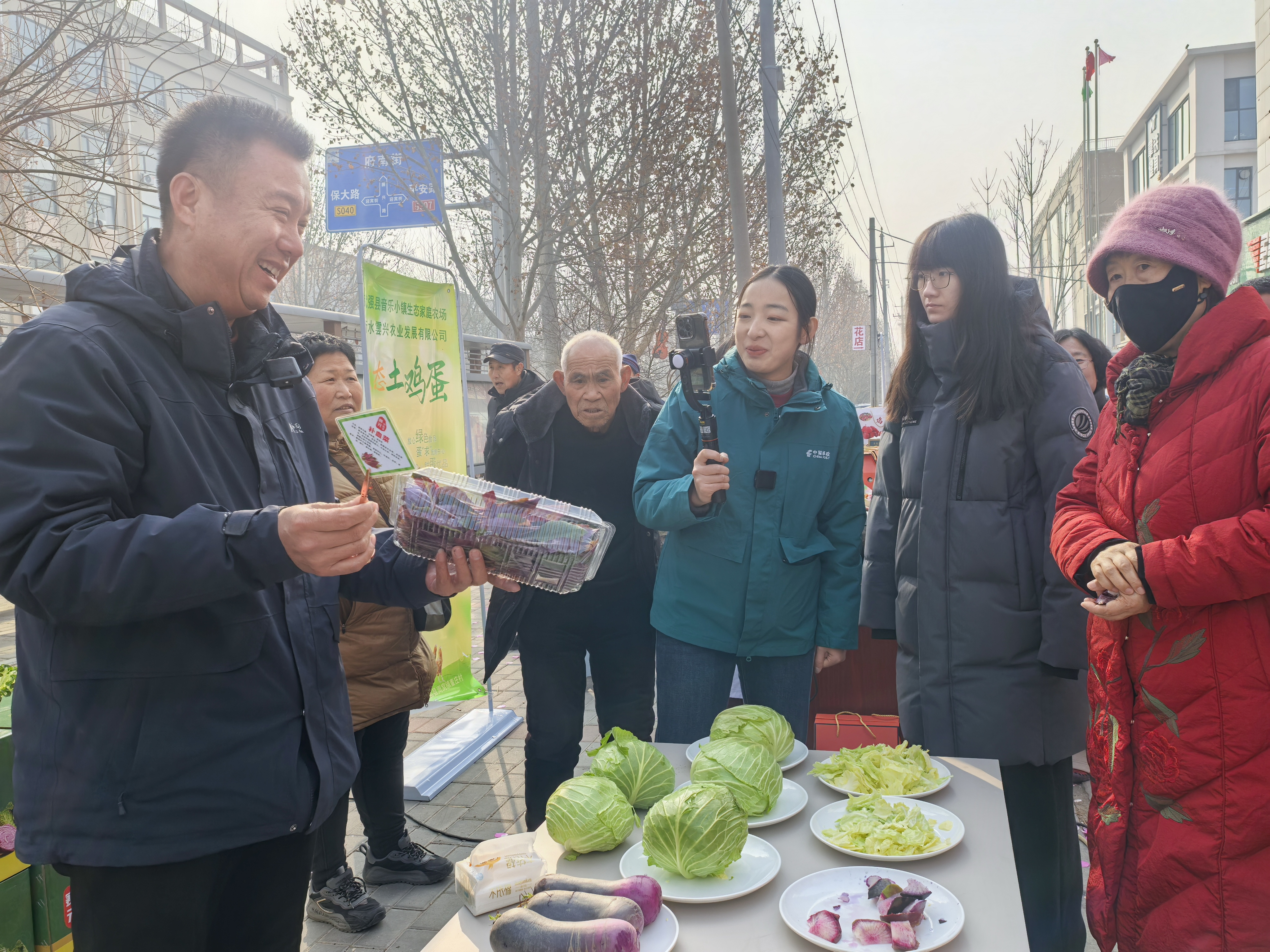 “今天咱们走到哪吃到哪!”展销中心门口,邮政主播热情的笑容和声音感染着屏幕前的观众。镜头扫过整齐排列的罐头礼盒、圆润光滑的富硒鸡蛋、色泽诱人的功能菜和现场介绍、问询、交易的人群,场景热闹非凡。