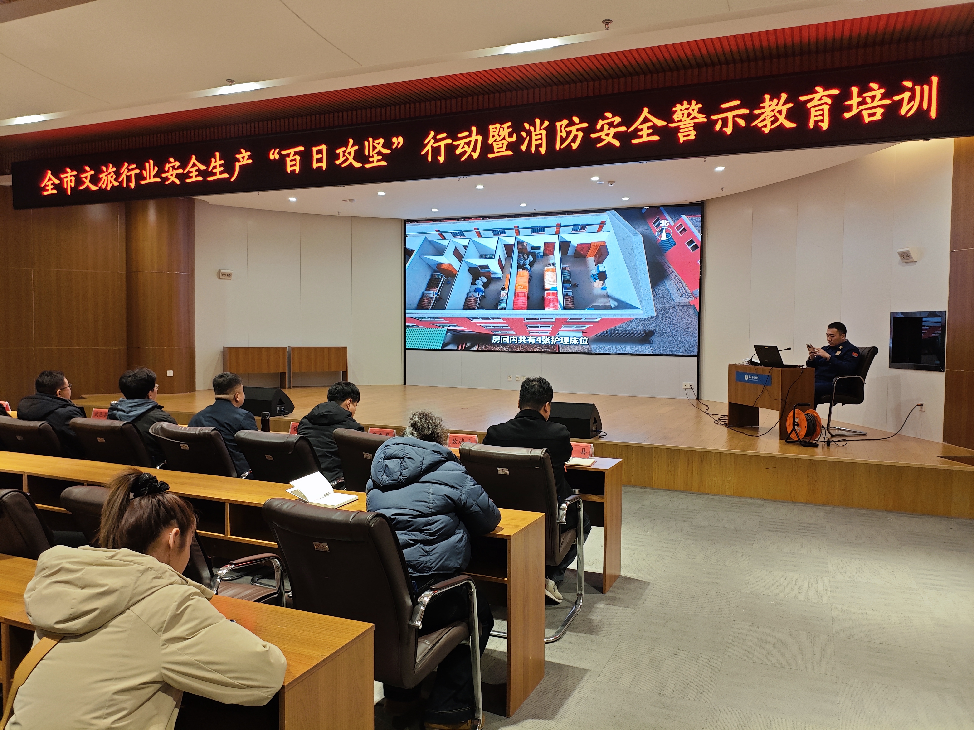 为进一步提升全市文旅行业消防安全意识和应急处置能力,做好岁末年初安全生产工作,牢牢守住安全底线,1月28日,市文化广电和旅游局邀请市消防救援支队为全市A级旅游景区、图书馆、文化馆、博物馆、歌舞娱乐场所、互联网上网服务营业场所等160余家文旅企业负责人和各县市区文旅部门安全工作负责人开展消防安全警示教育,让“安全弦”时刻绷紧,“防火墙”愈发牢固。