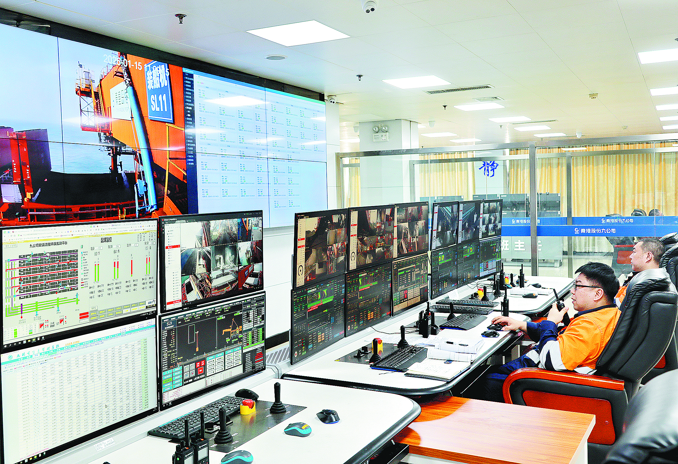 秦港股份九公司集控室内,装船机司机坐在办公室即可完成电煤装船的作业流程。