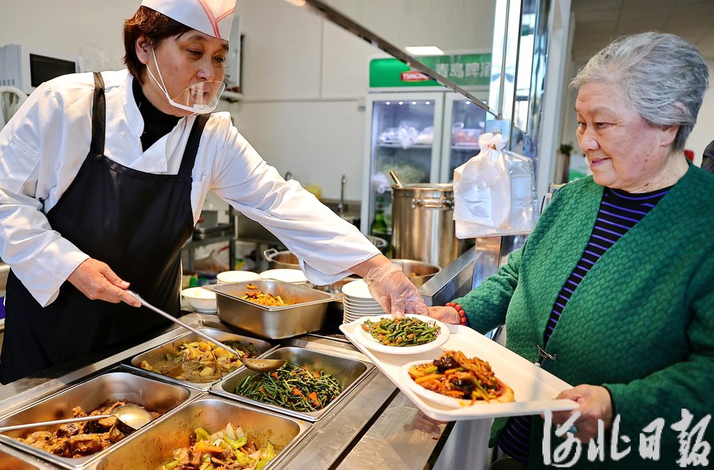 2025年12月25日,居民在秦皇岛市海港区万和城社区的颐港湾居家养老服务中心社区食堂打饭菜。河北日报记者 孙也达摄