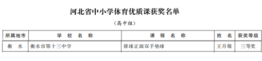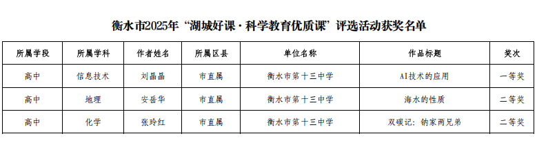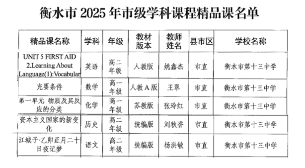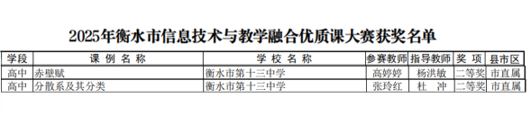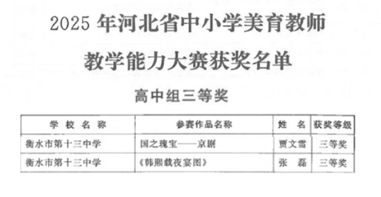 衡水十三中教师杨洪敏、刘秋香老师申报的课例成功获评2025年省级基础教育学科类精品课;刘晶晶老师在2025年河北省信息技术与教学融合优质课大赛中获中小学组二等奖;贾文雪、张磊老师获2025年河北省中小学美育教师教学能力大赛高中组三等奖;王月敬老师获2025年河北省中小学体育优质课高中组三等奖。