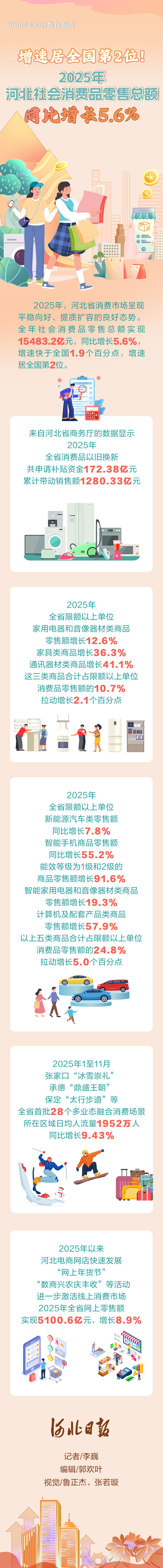 来源:河北日报 原标题:长图·2025河北经济数据解读丨增速居全国第2位!2025年河北社会消费品零售总额同比增长5.6% 点赞 +1 微博 微信 我要评论 发布 相关推荐 数据“生金” 产业焕新 ——景县打造县域数字经济新样本 美丽景州 4天前 雄安新区加快打造新时代的创新高地和创业热土丨产业集聚,数字经济蓬勃发展 关注 04-11 纵览·数里画|以花为媒 河北绽放春日经济新活力 关注 04-06 税收数据显示 今年我省经济向新向优开局良好 关注 04-03 数据“生金” 产业焕新 ——景县探索县域数字经济新样本 美丽景州 04-03 图说发布会丨向新向优!税收数据里看河北一季度经济 关注 04-02 一张发票的“乘数效应”——石家庄“有奖发票”撬动春日经济热潮 关注 03-27 热门 一天 三天 一周 1 衡水市全民阅读活动周暨五一惠民书市系列活动启动 2 衡水阅读推广人王贺梅:以初心赴公益 用书香润安平 3 武邑县多部门联合开展“全民阅读活动周”主题活动 4 【乡村行 看振兴】倪庄村的三条“振兴路” 5 公益宣传片|尊重版权 为创新护航 6 十八而志正当时 风华正茂少年郎 衡水中学举行2024级学生成人典礼 7 营造放心消费环境 冀州区开展“明码标价宣传月”活动 8 河北阜城:全民阅读润人心 激发群众阅读热情 9 第十四届全国班主任年会暨衡水中学德育工作现场观摩会举办 10 武邑:爱国主义教育进校园 青春担当铸魂育人 1 衡水文旅“春意浓”:多元产品激活春日市场 2 4起整治形式主义为基层减负典型问题,公开通报! 3 衡水市冀州区开展“阅见书香之美 共筑阅读之城”春季书香节主题活动 4 衡水市2026年新时代乡村阅读启动仪式在武邑举办 书香赋能乡村振兴 5 阜城县6万余亩西瓜喜获丰收 科技赋能助农增收 6 【新思想引领新征程】推进数字中国建设 打造高质量发展新引擎 7 2026年京津冀“衡实杯”马术赛完赛 8 湖畔诵经典 花海品书香——衡水市全民阅读热潮涌动 9 衡水市原创歌曲优秀作品展演在安平杨屯唱响 10 七百株百年牡丹在阜城县霞口镇安新家 1 景县王千寺镇中心小学举办校园科技节活动 2 【最美夕阳红】琴弦伴岁月 国粹润夕阳 ——衡水退休教师刘存水奏响晚年幸福曲 3 普及国安知识 筑牢思想防线 武邑县举办全民国家安全教育日集中宣传活动 4 【小牛大凯帮办团】衡水:露天垃圾池拆了 崭新垃圾桶“上岗” 5 “机械联动+人工补扫” 衡水主城区打响“飞絮治理战” 6 看图学习|筑牢网络安全和数据安全防线 总书记关心的“网事” 7 桃城区委网信办开展4·15全民国家安全教育日主题宣传活动 8 以爱为灯 照亮乡村阅读路 衡水乡村教师马久爱点亮孩子精神星空 9 雄商高铁河北段开始联调联试 10 衡水市阜城县漫河镇后李庄村:5天打通35亩大棚“生命线” 广告 广告 广告 24小时 1 独家视频丨习近平会见莫桑比克总统:中莫传统友谊穿越历史 跨越山海 2 独家视频丨习近平:将双边关系提升为新时代中莫命运共同体 3 雄安努力建设新时代创新高地 4 我的雄安日志|在“机器人学校”当一天“班主任” 5 京雄快线进入联调联试阶段 6 京津研发河北转化进行时 | 纳米技术让印刷产业绿起来 7 河北推动“河北净菜”进京入津提质扩容 8 京津冀旅游景区联票串起200多家优质景区 9 【“十五五”开局看河北】重点项目加速推进 新兴产业集聚动能 10 【经济新观察】全球铝市市场缺口扩大 河北铝业缘何逆势上扬?