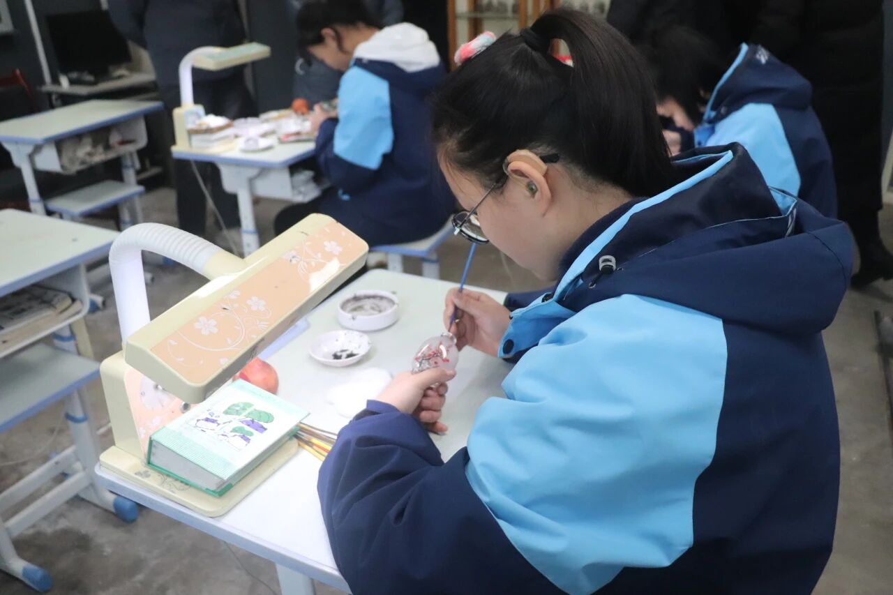 我们静静观察了孩子们学习内画的过程。笔尖在瓶中细腻地勾勒,小小的空间里承载着他们专注的世界。随后,在一个教室,一个孩子看到我们来访,开心地拍起手来,笑容纯粹而明亮。音乐教室里,合唱声响起,一首《明天会更好》被唱得真挚而充满希望。
