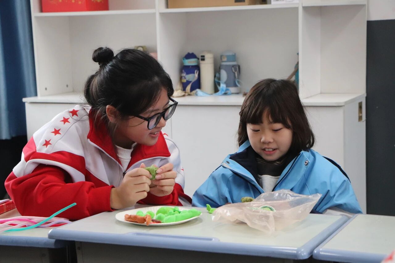 我和一个男孩一起捏黏土。我轻声和他说话,他时而回应,时而哼着歌,手中慢慢捏出饺子的形状。尽管交流简短,但我记住了他喜欢红色、爱唱歌、也爱堆雪人。分别时,他紧紧抱着我的本子不愿松开——那一刻,沉默的动作胜过千言万语。