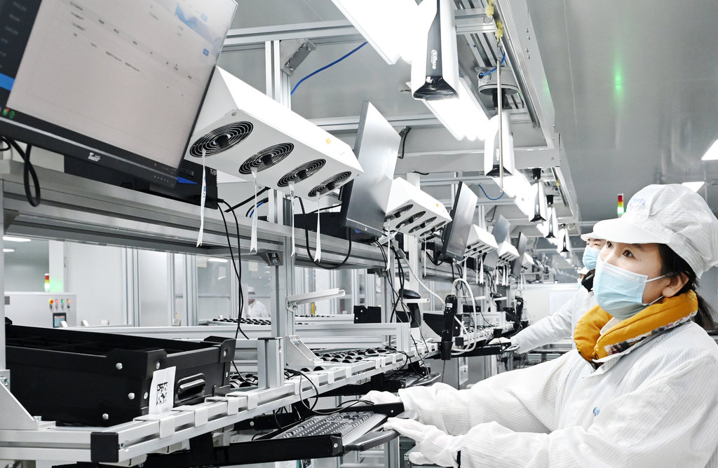 1月23日,位于雄安科创中心中试基地的雄安百信信息科技有限公司生产车间内, 工作人员正在检验生产线上的产品。河北日报记者 刘光昱摄