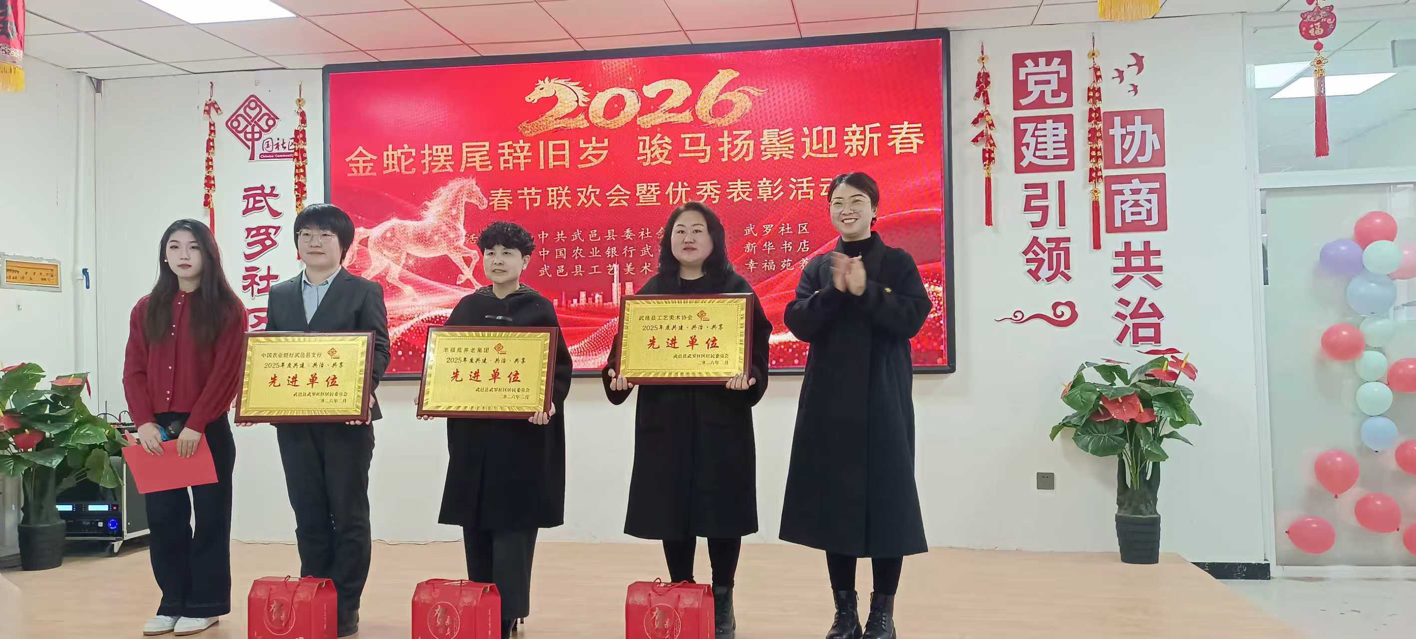 2月5日,武邑武罗社区新时代文明实践站内歌声悠扬、掌声阵阵、暖意融融。由武邑县委社会工作部、武罗社区联合中国农业银行武邑县支行、新华书店、幸福苑养老集团、武邑县工艺美术协会联合举办的2026马年春节联欢会正在热闹上演。活动吸引了辖区众多居民参与,大家欢聚一堂,共同描绘出一幅邻里和睦、喜乐祥和、共迎马年新春的美好画卷。