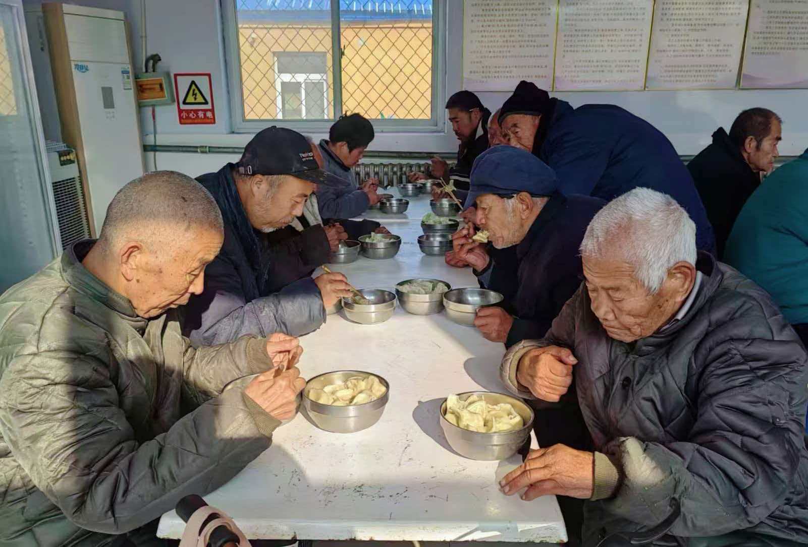 “大爷,夜里睡得踏实不?”“阿姨,您身子骨真硬朗!”贴心话语伴着饺子香,在屋里缓缓流淌。老人们看着忙碌的身影,脸上笑意盈盈,不时搭把手、聊几句,温馨氛围驱散了寒意。
