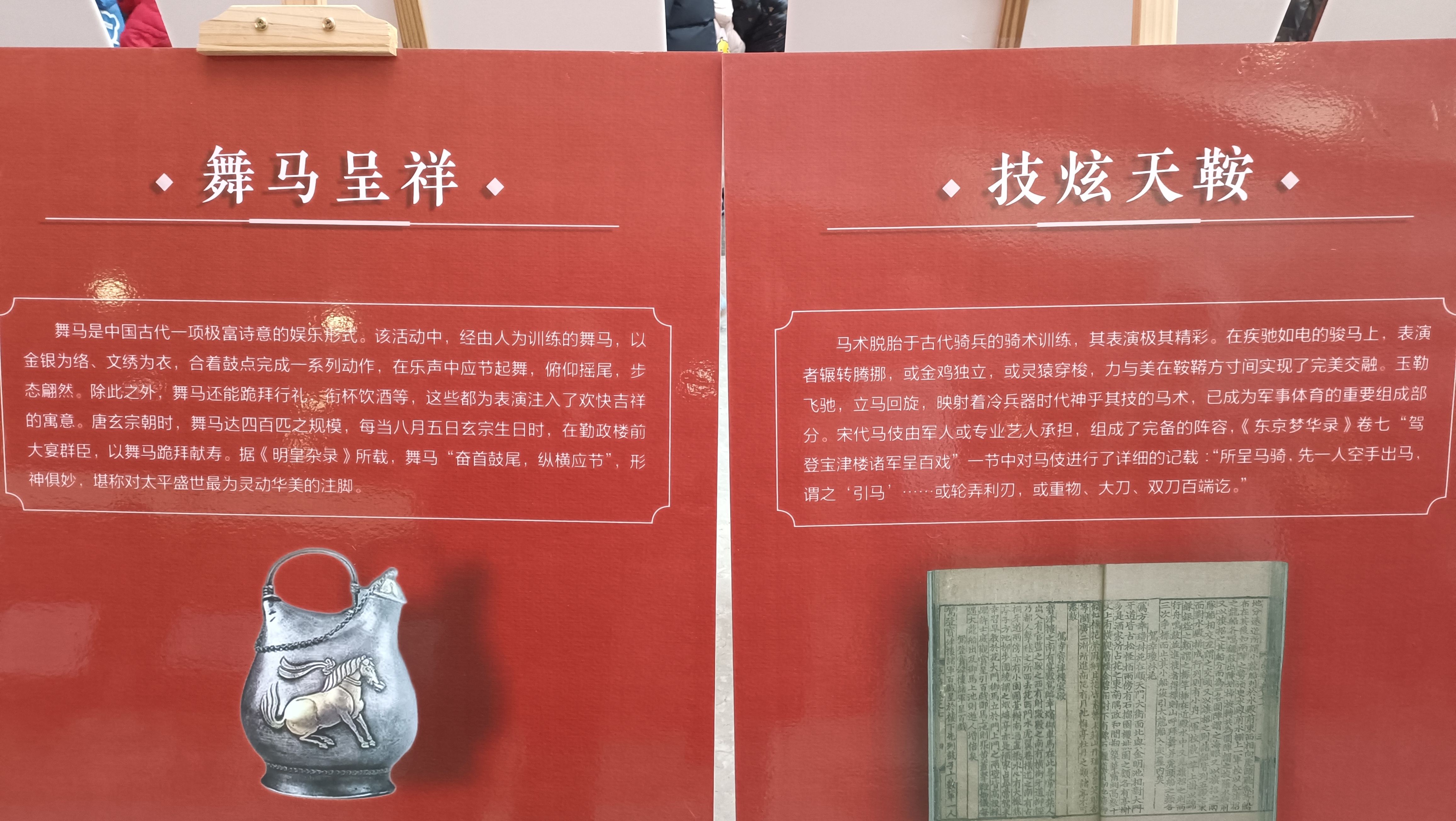 本次展览选取全国各地博物馆馆藏文物图片,以图文形式全面解读马与华夏民族的内在联系,回溯中国马文化的历史脉络,展示马与华夏文明相互印证的文物与艺术品,使观众对马有一个全面、系统的了解。展览分为“驭风韵俗”“骏功昭世”“文典寻骢”“骐骝骅骥”四个单元,“驭风韵俗”溯源丰富多彩、内涵深厚的马文化习俗,聚焦人与马和谐共生的文化内核,揭示其中承载着的民众对幸福生活的美好期盼和自强奋进的精神气质。“骏功昭世”通过典籍记载回顾马在人类生产生活、交通军事、娱乐庆典等方面的多重角色与贡献,展示其升华而成的精神图腾。“文典寻骢”探寻典籍文献中的马,梳理不同历史时期、不同载体的文献中所描绘的形象,阐明马如何超越自然属性成为中华民族精神文明的重要载体。“骐骝骅骥”讲述传奇名马故事,展示马超越坐骑本身所承载着的忠诚、勇猛、传奇、天命等民族精神,历经千百年传诵后,它们已经演化为文化图腾,成为历史中跃动的灵魂印记。