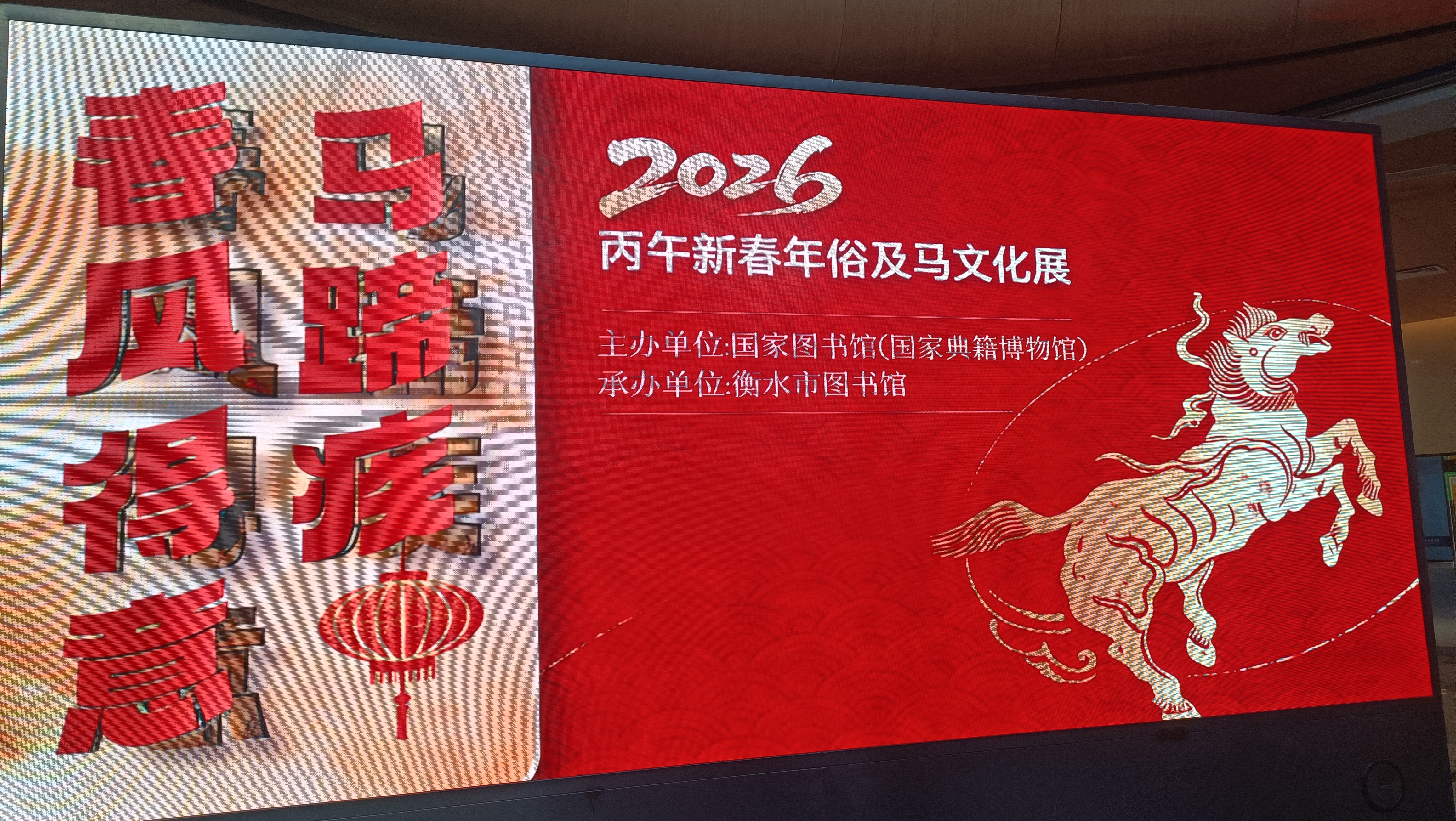 2月8日,由国家博物馆主办,衡水市图书馆承办的“春风得意马蹄疾”丙午新春年俗及马文化图片展览在市图书馆举行,展览全方位、多角度系统阐释马在自然、历史与艺术等多重维度中的文化意蕴,生动展现中华马文化跨越时空的丰富表达与精神传承。