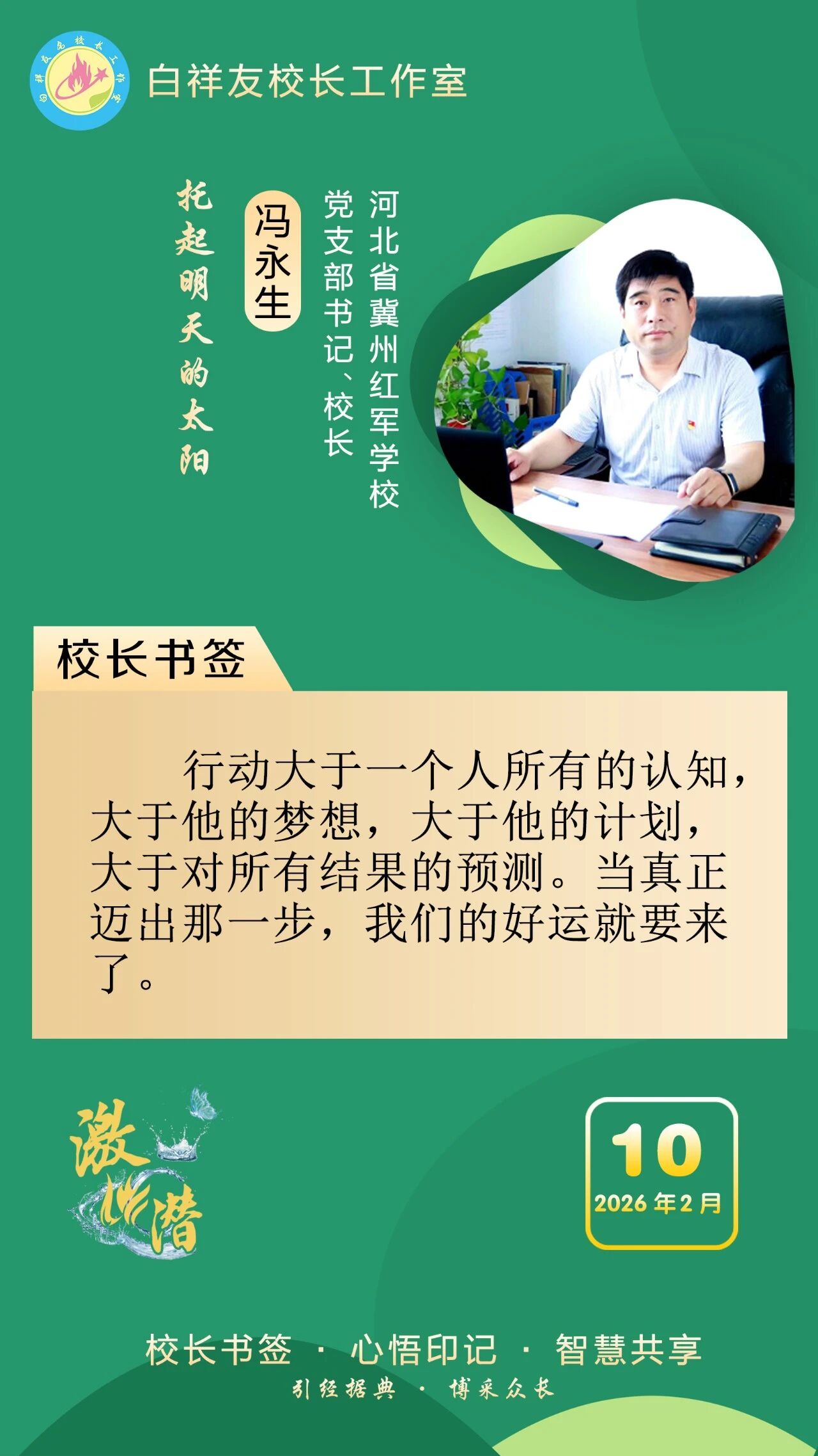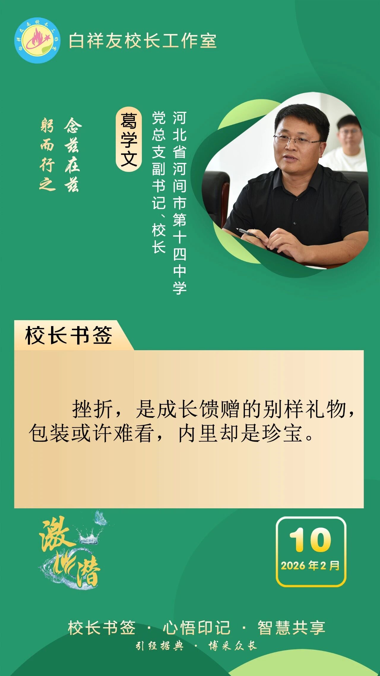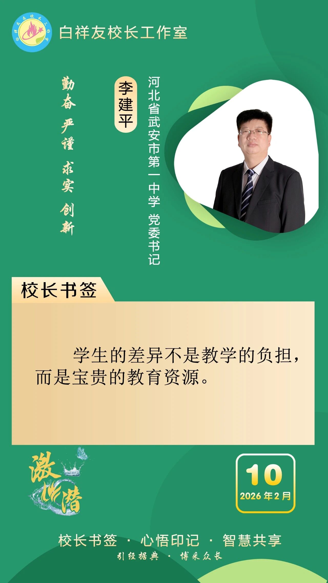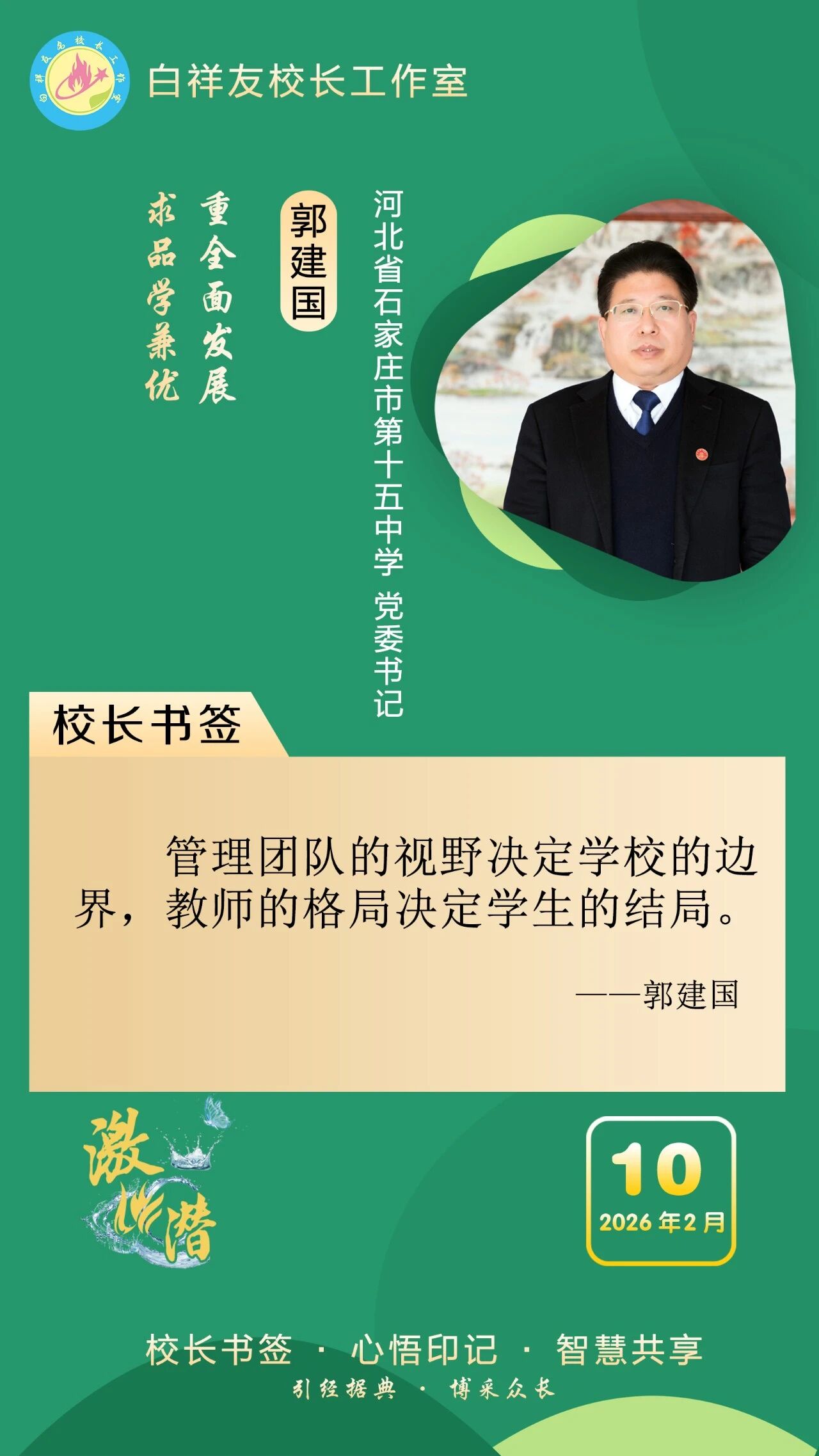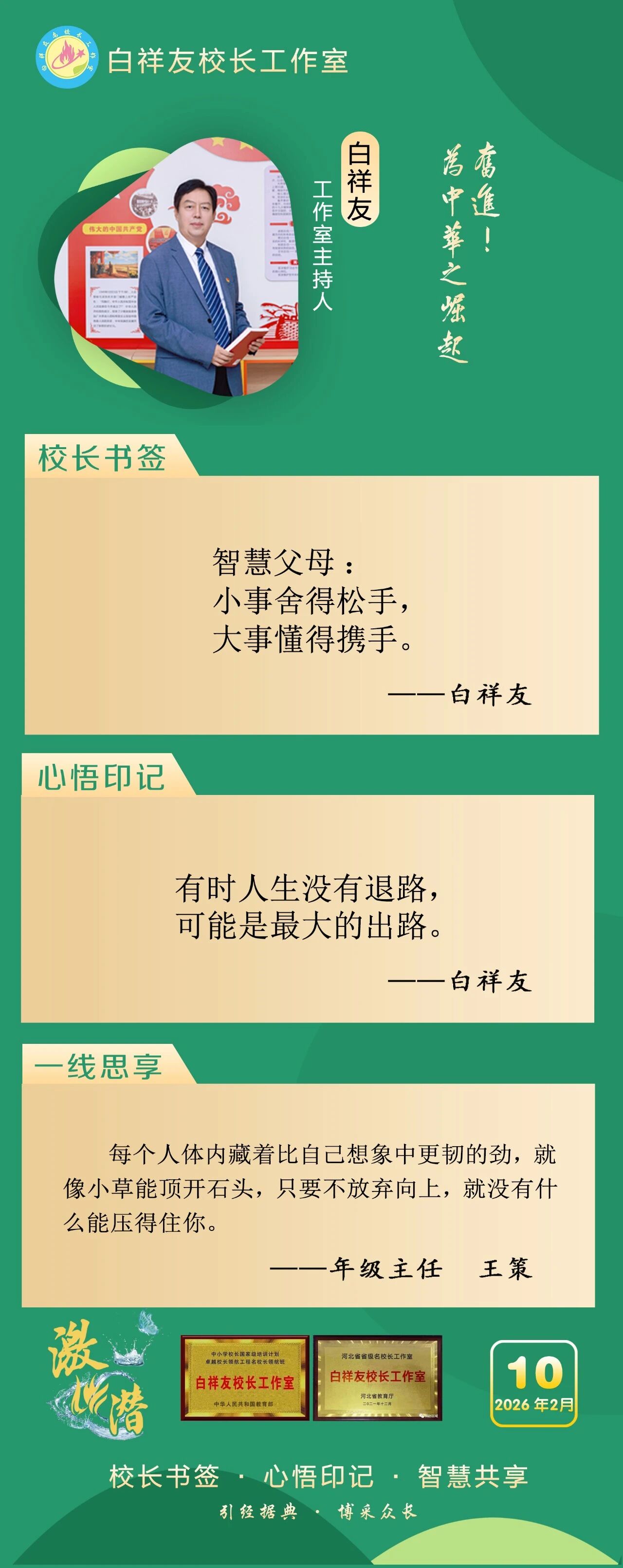 “白祥友校长工作室”成立于2019年4月,是教育部“国培计划”中小学名校长领航工程、河北省首批名校长工作室,目前省内外成员校59所。工作室坚持“资源共享、智慧共融、互助共赢”理念,已成为思想碰撞的交流场,资源共享的品牌站,成果展示的辐射源。 点赞 +1 微博 微信 我要评论 发布 相关推荐 白祥友校长工作室成员新疆实验中学冯永庄校长一行来衡水十三中参观交流 教育大观 03-23 衡水市名校长大讲堂在衡水十三中举办 教育部中小学校长培训办公室于维涛主任作专场报告 教育大观 01-19 白祥友校长工作室成员带队参观衡水十三中 教育大观 2024-05-22 “白祥友校长工作室”成员校石家庄十五中百余教师来衡水十三中参观 教育大观 2024-04-01 热门 一天 三天 一周 1 “星火照初心·笔墨传精神”创作采风系列活动在衡水市安平县启动 2 衡水市药品不良反应监测中心获全国通报表扬 3 武邑县多部门联合开展“全国肿瘤防治宣传周”主题宣传活动 4 姚黄魏紫初绽蕊 满园春色惹人醉 衡水中华公园牡丹花开了 5 衡水德州市场监管联动 优化外资营商环境 6 百余件(套)冀派内画精品走进甘肃瓜州 7 礼乐润童心 古训焕生机——孙敬学堂以沉浸体验激活传统文化 8 武邑:义诊进社区 健康“零距离” 9 衡水市第三人民医院开展肿瘤防治宣传周义诊活动 10 守护市民“脚下安全” 衡水主城区沥青路面病害集中整治见实效 1 雄商高铁河北段开始联调联试 2 舞蹈、绘画、音乐……衡水公益课堂今起报名 “双课堂”点亮全民艺术生活 3 【小牛大凯帮办团】衡水:露天垃圾池拆了 崭新垃圾桶“上岗” 4 景县王千寺镇中心小学举办校园科技节活动 5 全国首批试点收官 安平丝网产业提质成效显著 6 【最美夕阳红】琴弦伴岁月 国粹润夕阳 ——衡水退休教师刘存水奏响晚年幸福曲 7 以水为基强韧性 治水兴城护民生 ——武强县探索北方县域防洪排涝与水安全保障路径 8 “机械联动+人工补扫” 衡水主城区打响“飞絮治理战” 9 衡水市阜城县漫河镇后李庄村:5天打通35亩大棚“生命线” 10 为营商环境清障 故城县严惩职业投诉敲诈 1 第二十一届京津冀开发区“枣复材杯”乒乓球邀请赛暨招商引资推介会在枣强举行 2 衡水市举办0—6岁儿童孤独症筛查培训班 3 衡水开放大学2026年春季招生即将结束 4 “妈妈你在哪儿” 衡水刘风旭寻找走失18年的母亲盼团圆 5 《互联网平台价格行为规则》正式实施 明确禁止“大数据杀熟” 6 “迁徙有信·文脉有声”衡水湖生态摄影大赛颁奖暨赏花季采风活动圆满举行 7 “武邑红梨”牵手“硬木雕刻” 双IP联动助推农文旅融合与产业升级 8 海报系列||早安衡水 9 衡水滏阳河管理中心:亲近自然 文明露营 共同守护河畔美景 10 新华社评论员:为两岸谋和平 为同胞谋福祉 为民族谋复兴 广告 广告 广告 24小时 1 阜城县王集乡开展国家安全教育系列宣传活动 2 海报系列||早安衡水 3 习言道|多用一些时间静心读书、静心思考 4 【讲习所·中国与世界】习近平:中越要同心协力 携手同行现代化道路 5 衡水高新区开展“4·15全民国家安全教育日”主题宣传活动 筑牢基层安全防线 6 把安全种子“播”进群众心里 景县开展全民国家安全教育日宣传 7 促进行业发展 景县举办跨境电商培训班 8 数据“生金” 产业焕新 ——景县打造县域数字经济新样本 9 助力家长“从容带娃” “家庭教育进万家”活动走进安陵镇 10 赏花活动开启春日浪漫景县之约