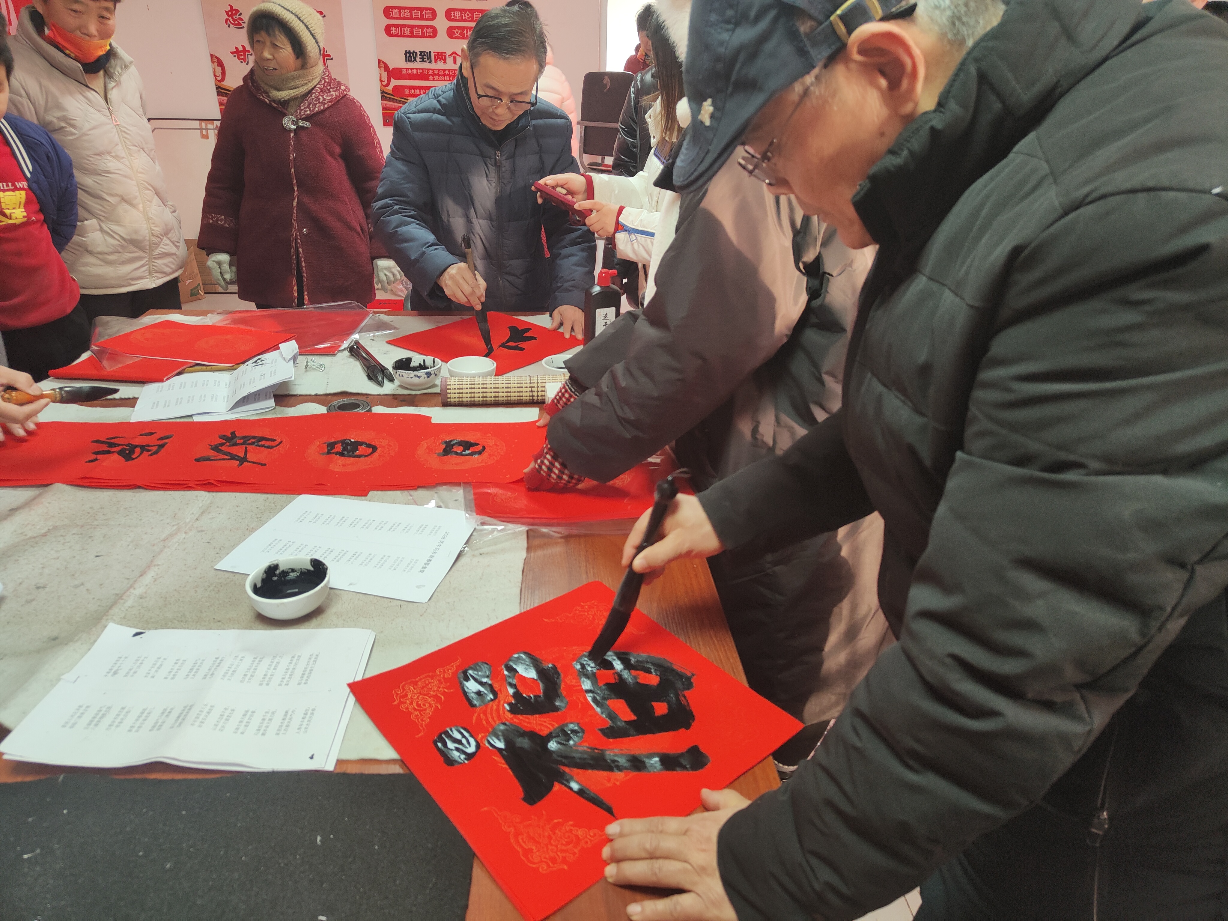 武邑县书法协会的老师们提前备好红纸、笔墨,紧扣新春主题挥毫泼墨。一幅幅笔力遒劲的春联、一个个饱满喜庆的“福”字跃然纸上,字里行间满是新年祝福。村民们围在一旁欣赏技艺、挑选春联,现场暖意融融。