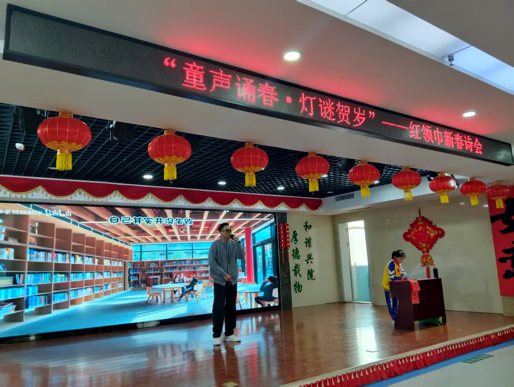 诗歌朗诵、舞蹈、葫芦丝独奏、英文歌曲独唱、说唱、书法……活动上半场,大家纷纷上台秀出自己的绝活儿,和小伙伴们共享新春的喜悦,展现青少年积极向上的精神风貌。每一次真诚的演绎,都赢得了热烈的掌声。轻松肆意又正能量满满的《你,好孩子》说唱表演,以其独特的节奏和积极的歌词,迅速点燃了现场气氛,赢得了阵阵喝彩。舞台一侧,始终静心凝神,将祝福落于笔墨、书写在春联里的少女引人注目。