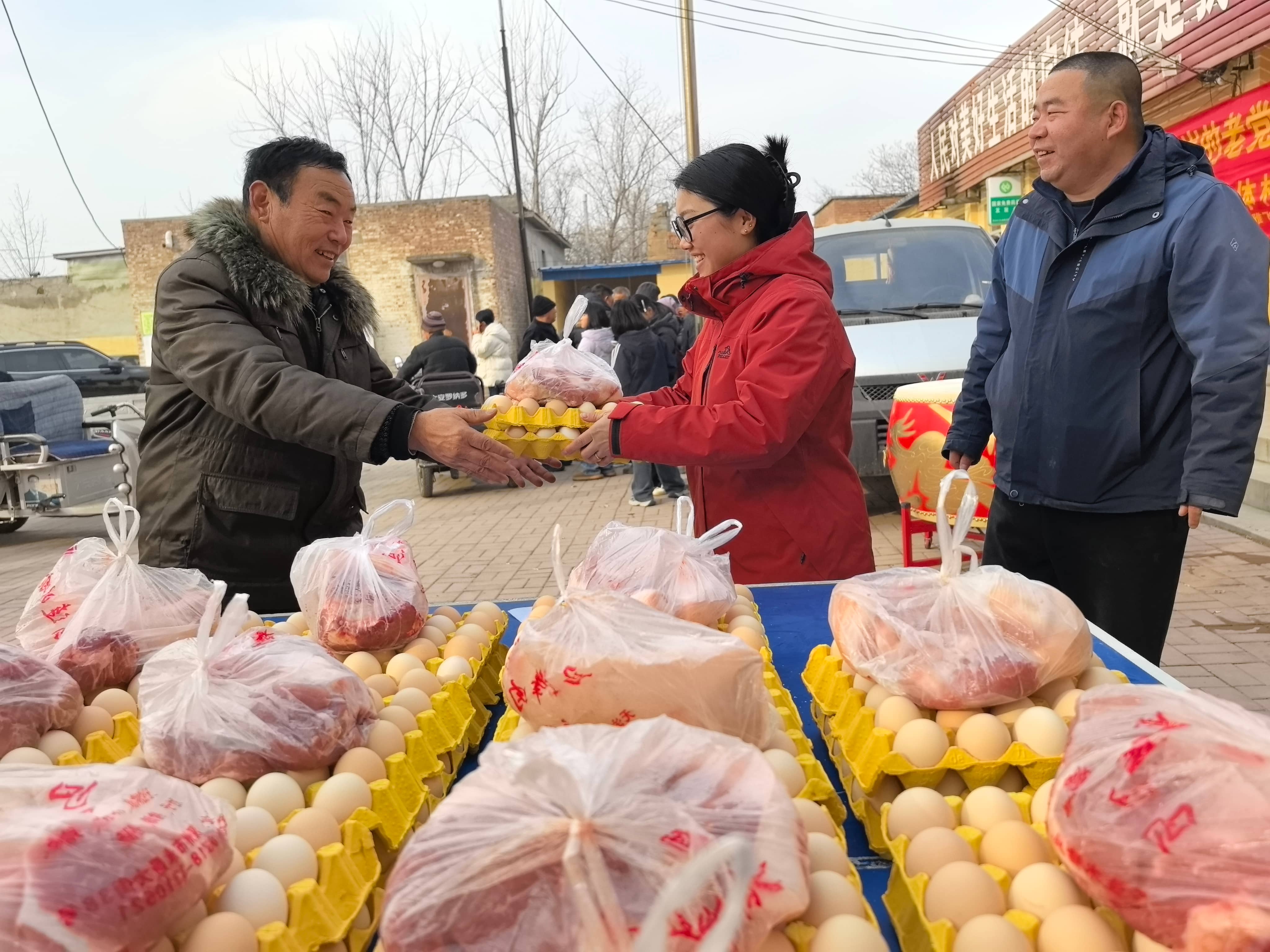 顺着村民的目光看去,村委会门前的三辆货车上,福利摆放得满满当当:左边是温家庄蛋鸡养殖基地准备的猪肉和鸡蛋,中间是海雄畜牧深州有限公司准备的牛肉和粉条,右边是河北凯盛畜禽养殖有限公司准备鱼和白条鸡。
