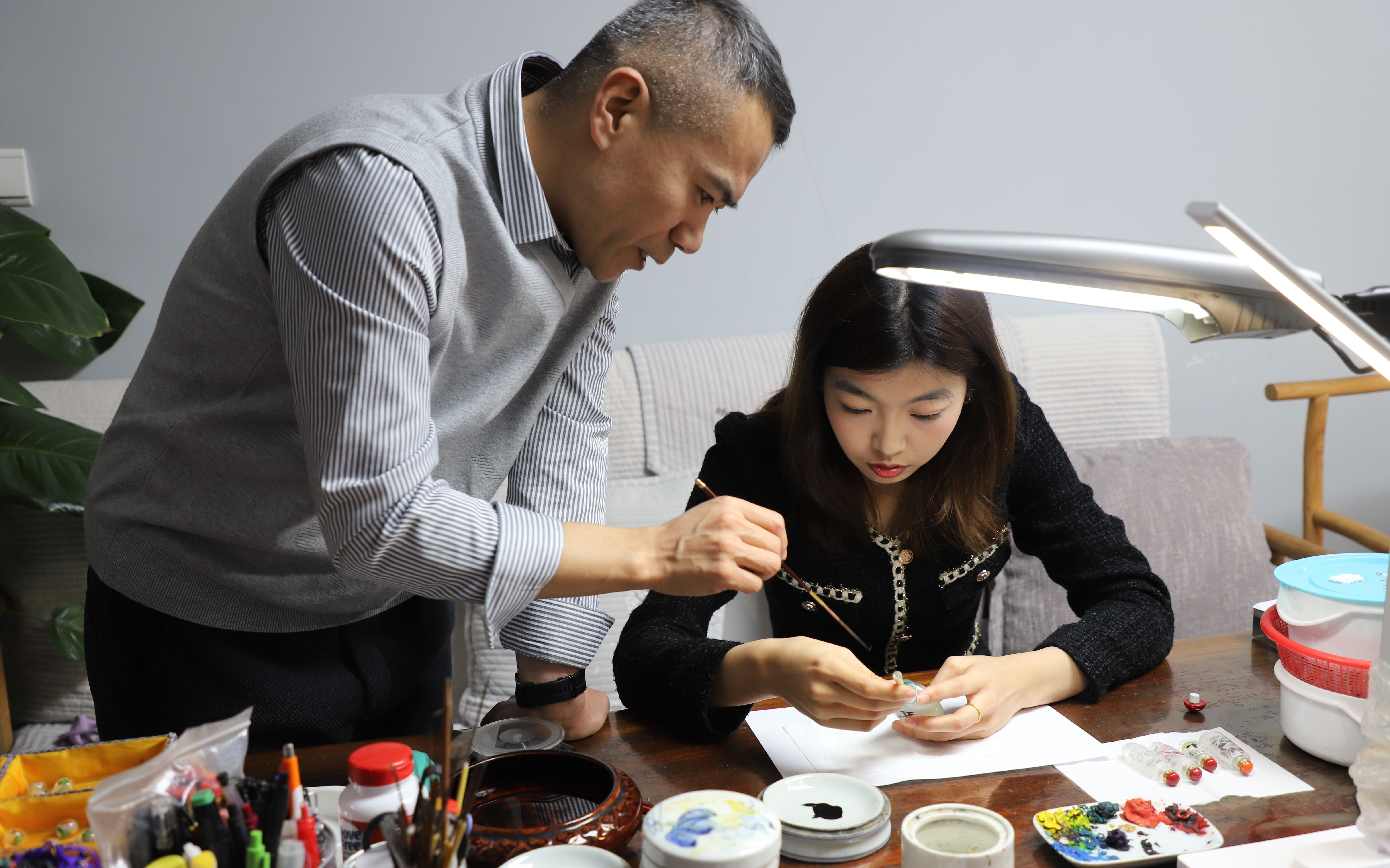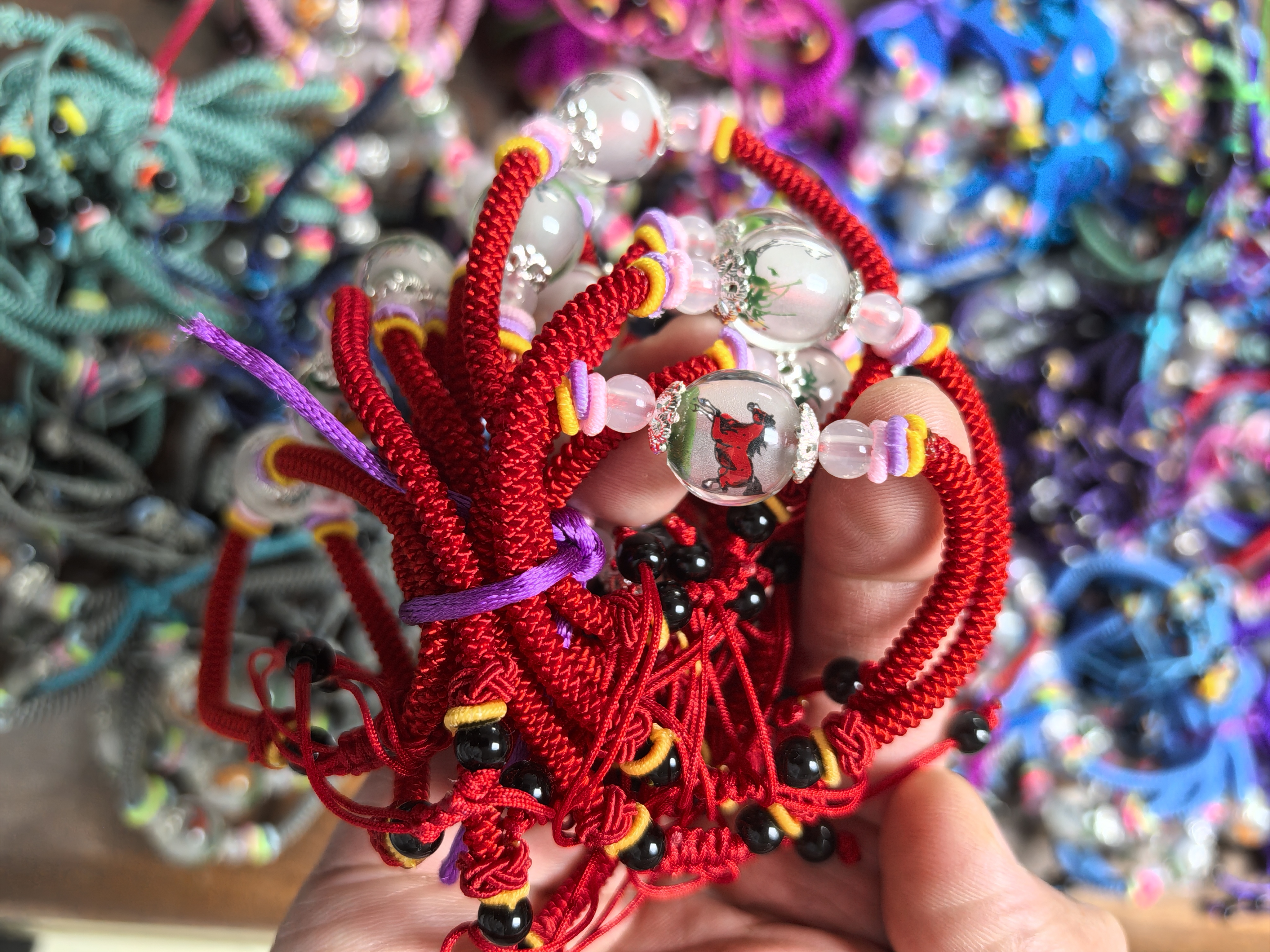 在胡晓然内画工作室里,则摆满了即将“出海”的内画水晶珠五彩手绳和鼻烟壶作品。“这次我们准备了5000件内!”他对已经完成的订单产品进行分类、清点。“上次展会上,老外对生肖、花鸟等题材的水晶珠手链特别感兴趣,我们就结合他们的喜爱,做了调整。”他说,除了增添中国元素的五彩手绳外,他还准备带一批高档内画鼻烟壶,走精品路线。
